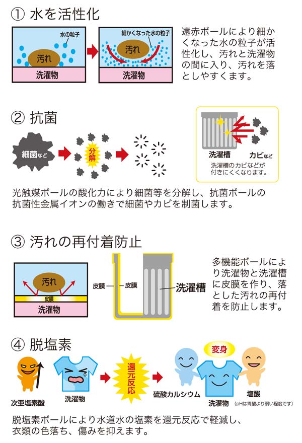 | 材質 | 外装ボール:ポリエチレン(耐熱温度:約60度) 内部:遠赤ボール・マイナスイオンボール・多機能ボール・脱塩素ボール・抗菌ボール・光触媒ボール・アルカリボール 浮き:発泡スチロール 袋:不織布 |