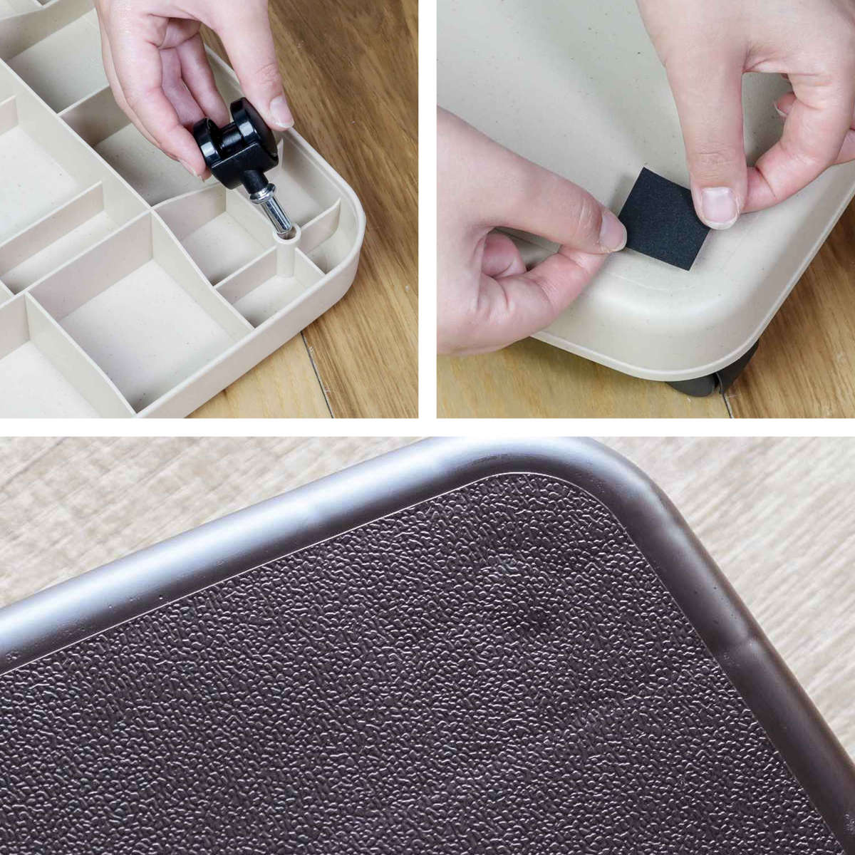 | 4つのキャスター 360度自由自在に動くキャスターで縦にも横にもスムーズに転がります。うち2つはストッパーが付いているので固定でき、安全にご使用いただけます。 | 滑り止めシールつき 約3×3cmのシールが4枚付属しています。四隅に貼り付けたり、前方にまとめて貼り付けたり、乗せるものに合わせて自由に貼り付けできます。 |