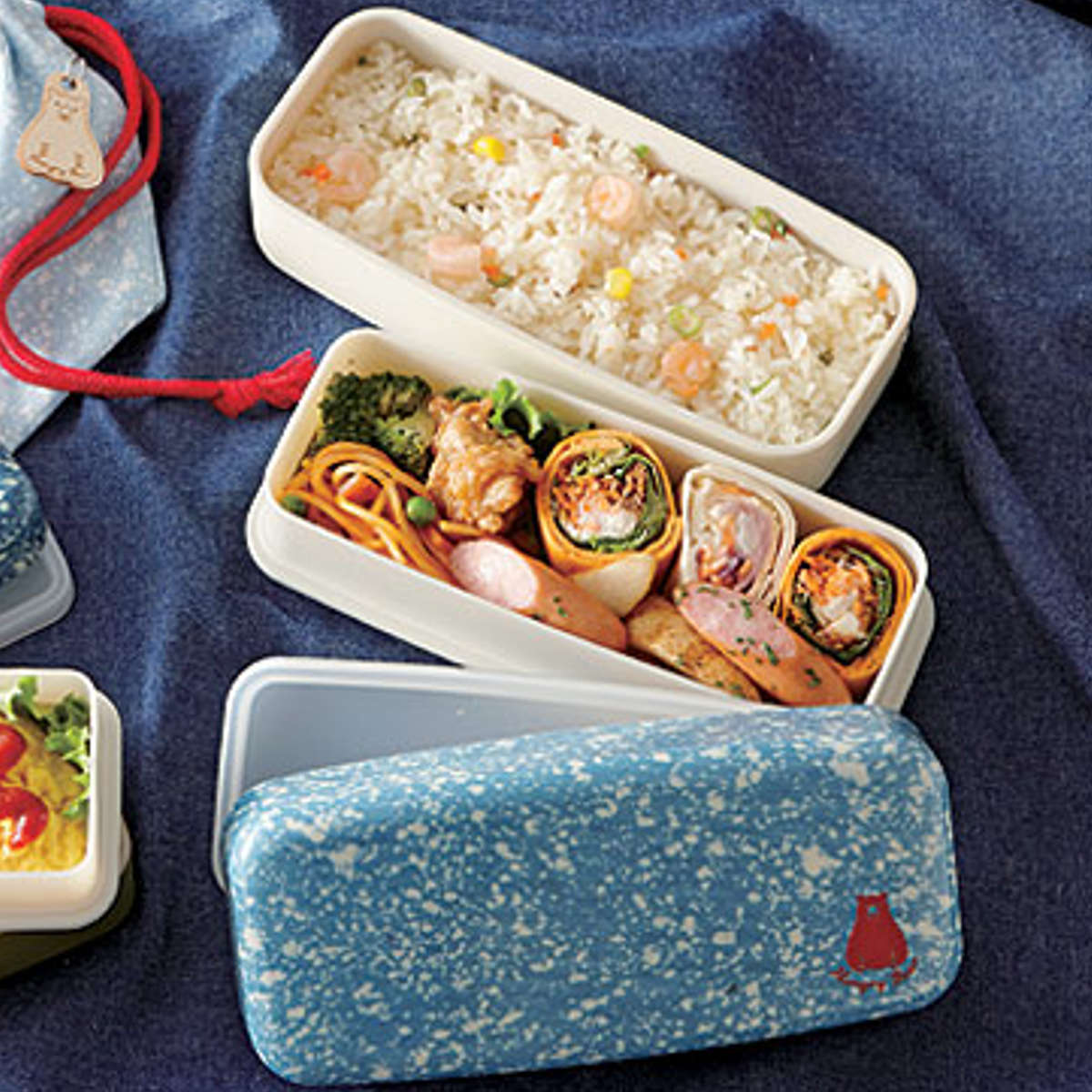 デニム生地をイメージしたオシャレな蓋に、真っ赤なクマがワンポイントの長角タイプ2段弁当箱です。大人の男性や育ち盛りの男の子にも満足してもらえる890mlサイズです。シール蓋付きなので、汁モレ匂いモレも気になりません