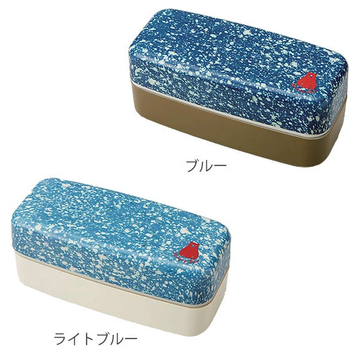 ●デニム生地をイメージしたオシャレな蓋に、真っ赤なクマがワンポイントの長角タイプ2段弁当箱です。