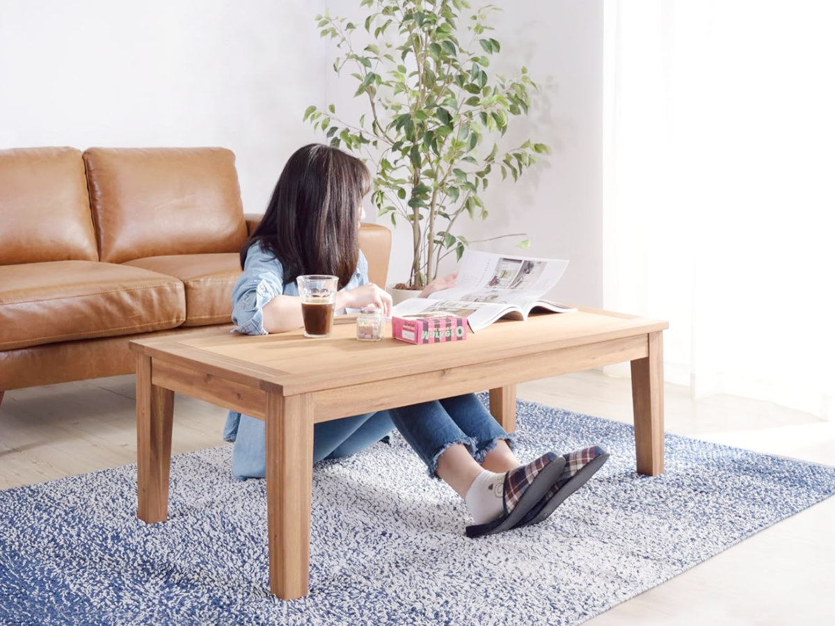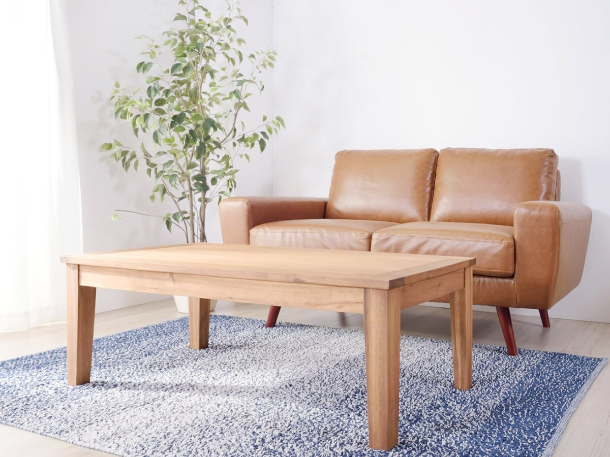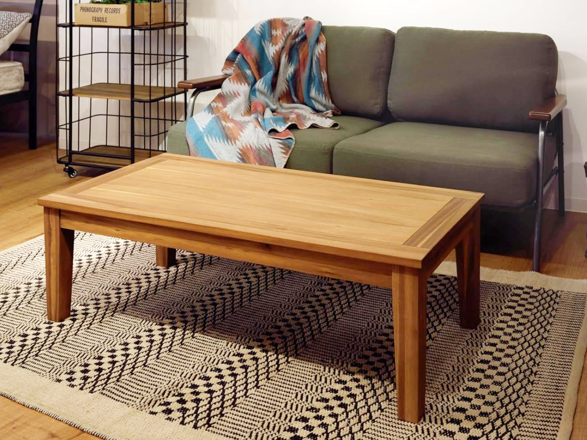 アカシア突板と天然木フレームを使ったローテーブル。美しい木目と自然な風合いが魅力で、オイル仕上げが温かみを添えます。幅110cmの天板は、くつろぎの時間や食事、作業スペースとしても活躍します。ご家族での団らんや来客が多いご家庭におすすめです。