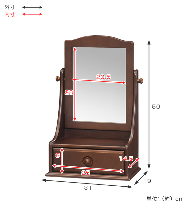 | サイズ | 約 幅31×奥行19×高さ50(台高さ19)/[ミラーサイズ]ヨコ20.5×タテ28(cm) 重量:約3.4kg 【内寸】[引き出し]幅25×奥行14.5×高さ8(cm) 【梱包】[重量]3.8kg |