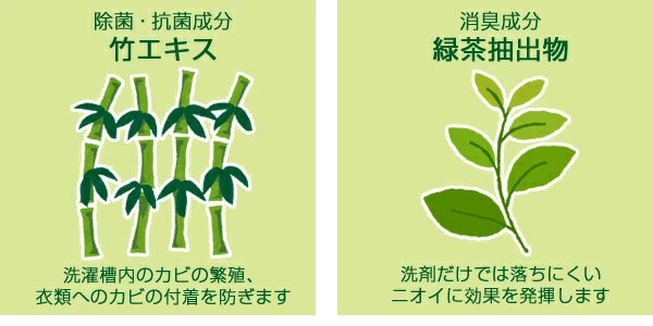 ●除菌・抗菌成分:竹エキス…洗濯槽内のカビの繁殖、衣類へのカビの付着を防ぎます。