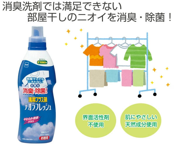 デオラフレッシュは洗剤だけでは落ちにくい部屋干しや汗などのニオイをしっかりとる洗濯助剤です。洗剤や柔軟仕上げ剤の香料のニオイも消臭します。(継続使用することによって効果が高くなります。)
