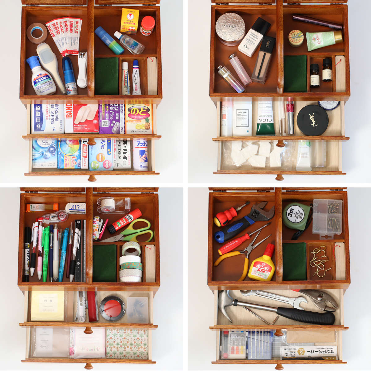 ソーイングボックスは裁縫道具を収納するだけでなく、様々なシーンンの収納ケースとして活躍してくれます。常備薬や絆創膏などを入れて、薬箱として使ったり、メイク用品を入れてメイクボックスとしてもお使いいただけます。また、文房具や工具などの収納にもおすすめです。