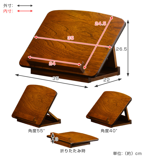 | 備考 | 完成品 【特徴】読書や御手本台に便利です。/角度が2段階に調節でき、使わない時にはコンパクトに折りたためます。(角度55度/40度) |