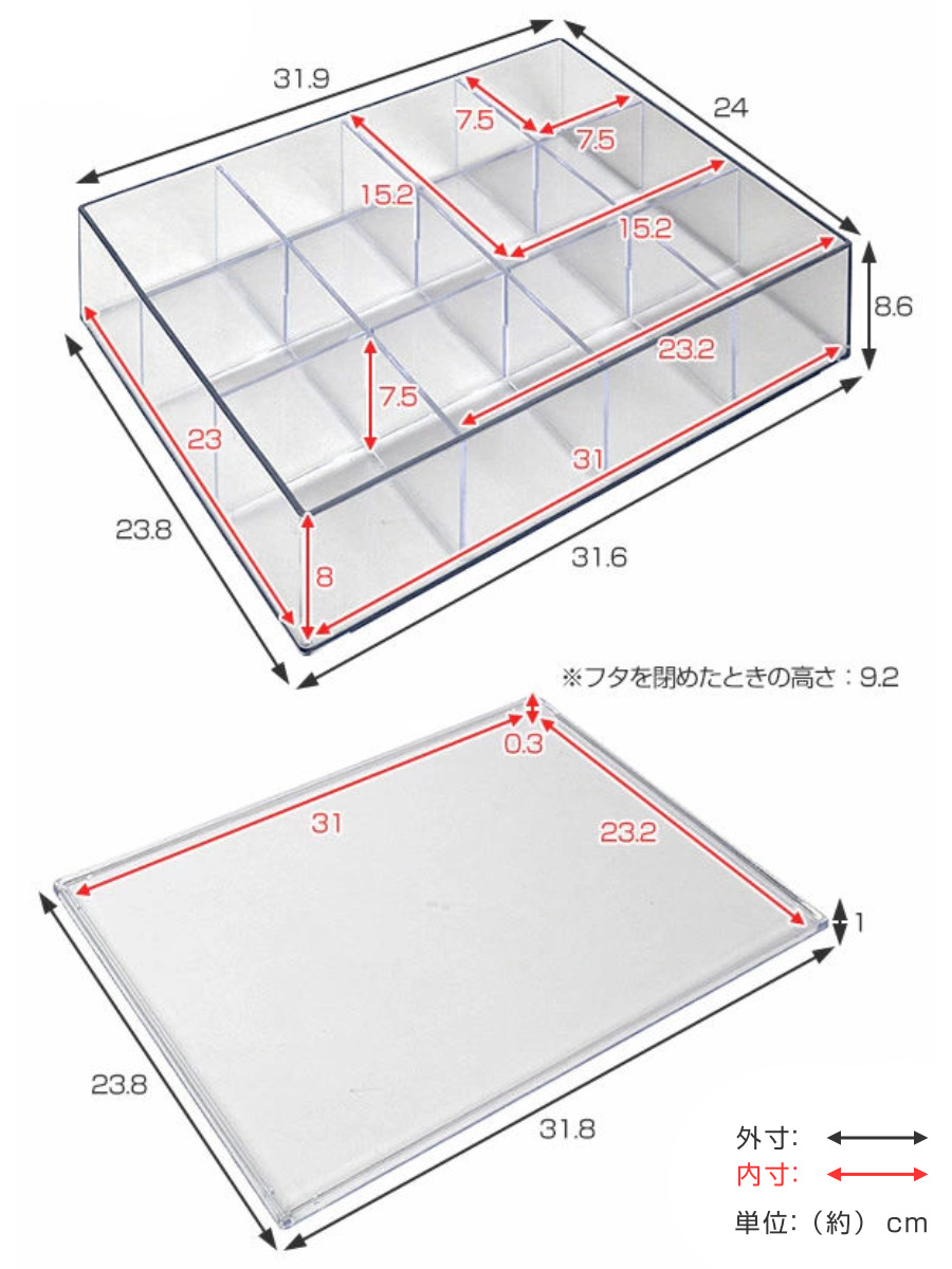 | サイズ | 約 幅31.9×奥行24×高さ9.2(cm) 仕切り1つ分の内寸:約 幅7.5×奥行7.5×高さ7.5(cm) 仕切りを全て外した内寸:約 幅31×奥行23×高さ8(cm) |