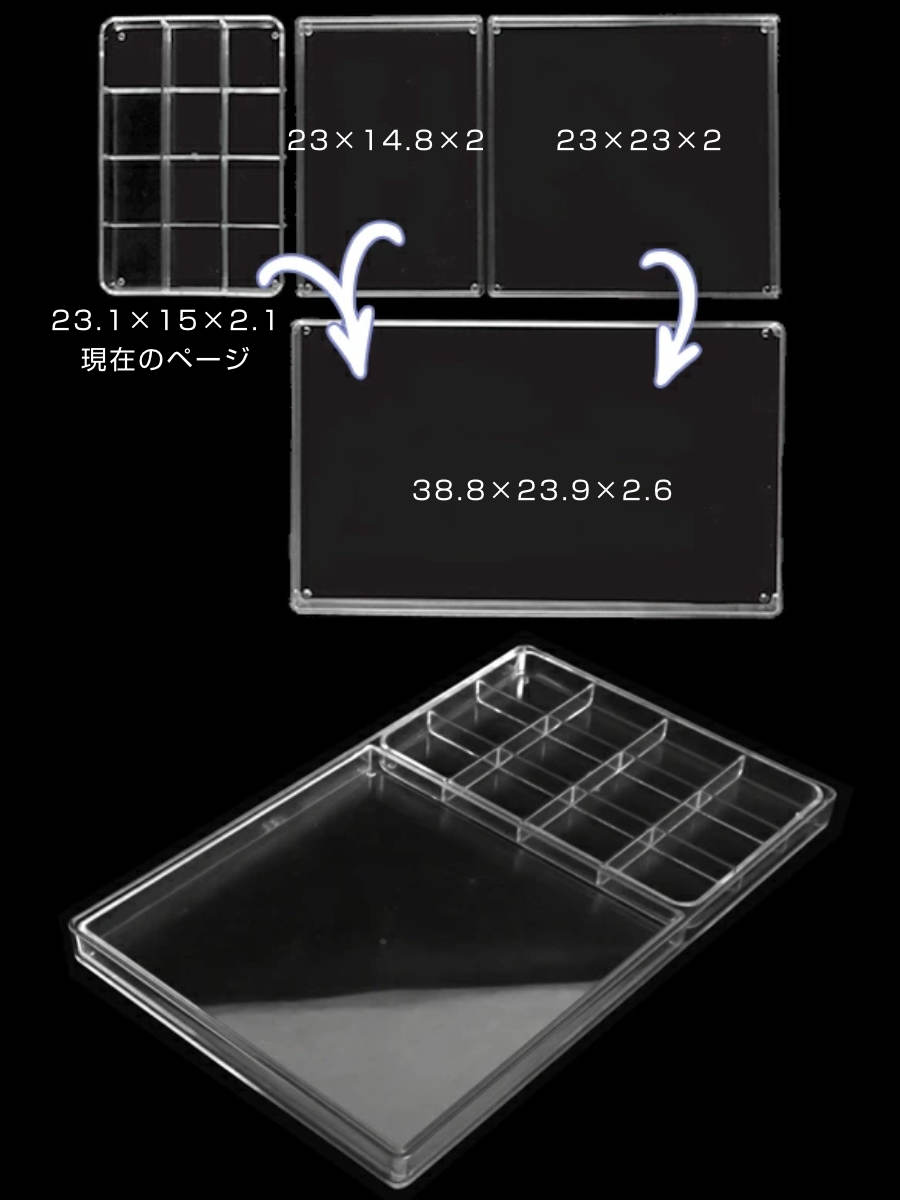 【トレー大(38.8×23.9×2.6)】の中に、【トレー中(23×23×2)】と【トレー小(23×14.8×2)】、