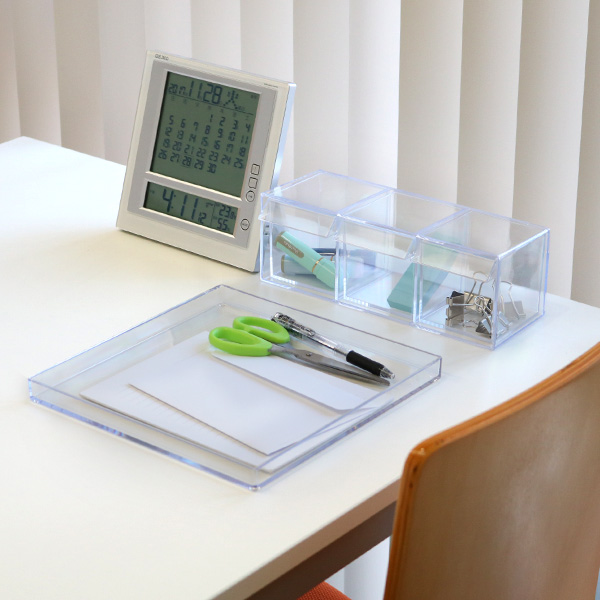 デスク上で文房具、リビングでリモコンや小物類をまとめるのに最適なクリアケースです。透明でシンプルなケースは、中が見えるので収納物を把握しやすいところも嬉しいポイントです。