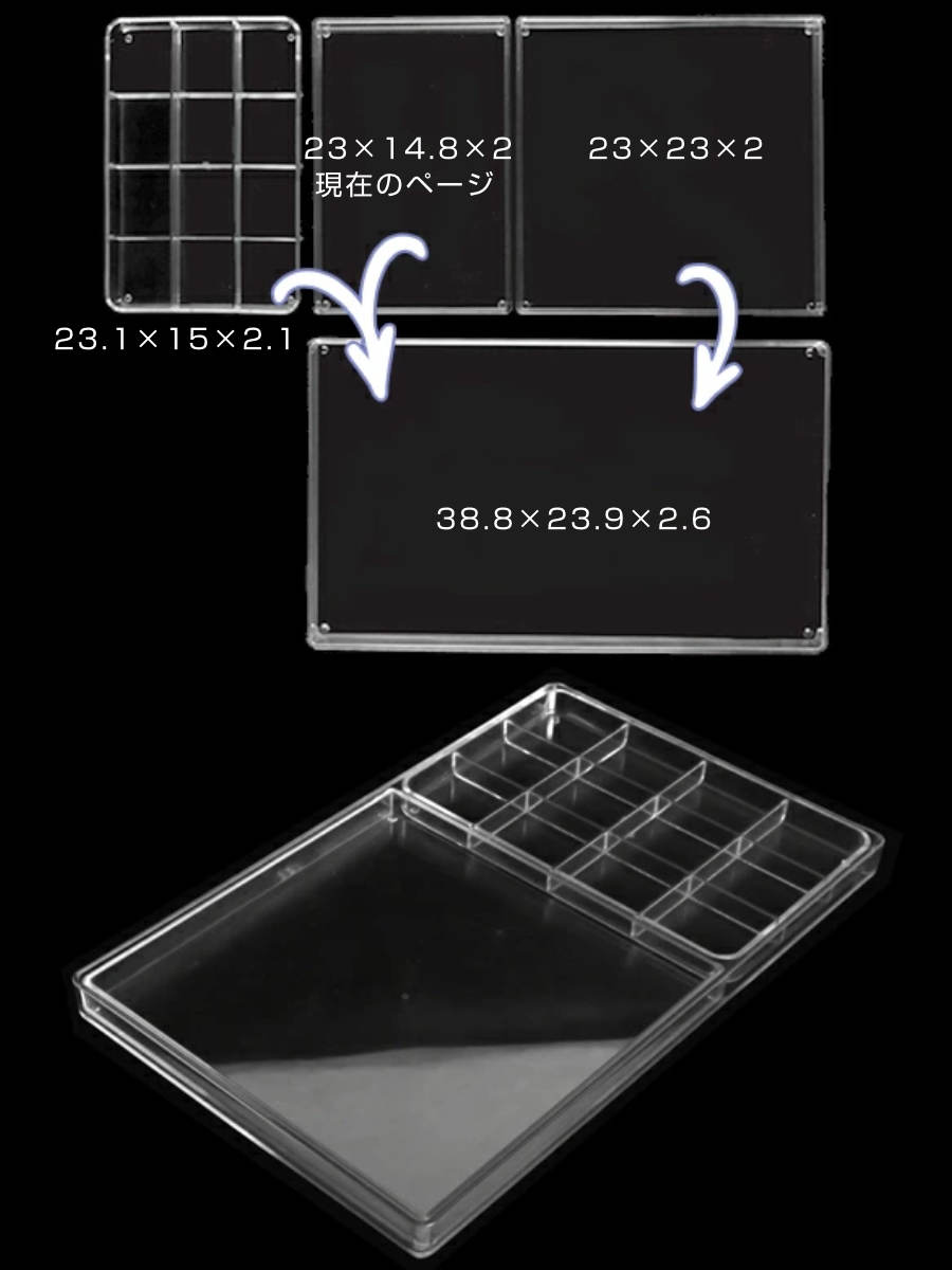【トレー大(38.8×23.9×2.6)】の中に、【トレー中(23×23×2)】と【トレー小(23×14.8×2)】、