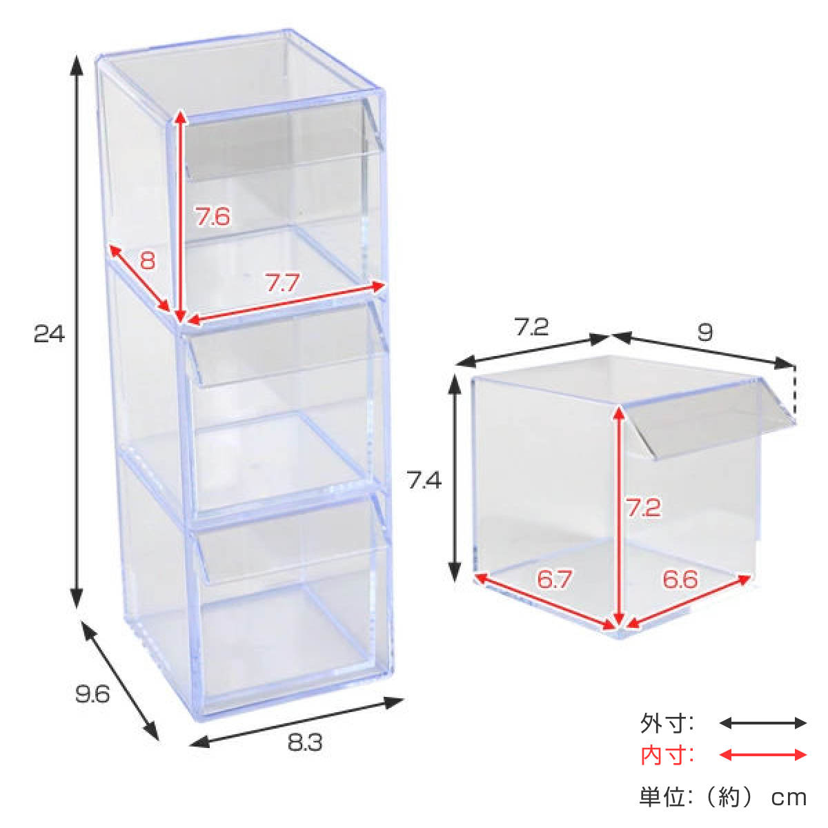 | サイズ | 外寸:約 幅24×奥行9.6×高さ8.3(cm) 内寸:約 幅6.6×奥行6.7×高さ7.2(cm) ※内寸は引出し1個あたりのサイズ |