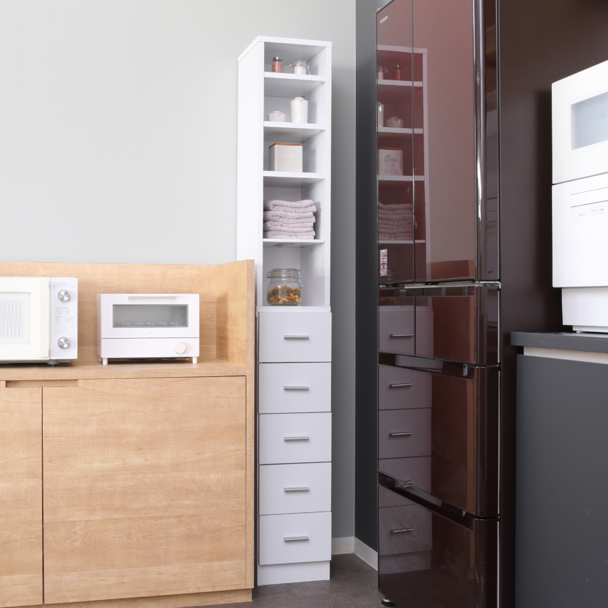 濡れた手でもサッとタオルを引き出せるので、キッチンでの使用にも最適です。オープン収納には食器やマグカップを、引出しにはカトラリーや食材のストックを収納できます。