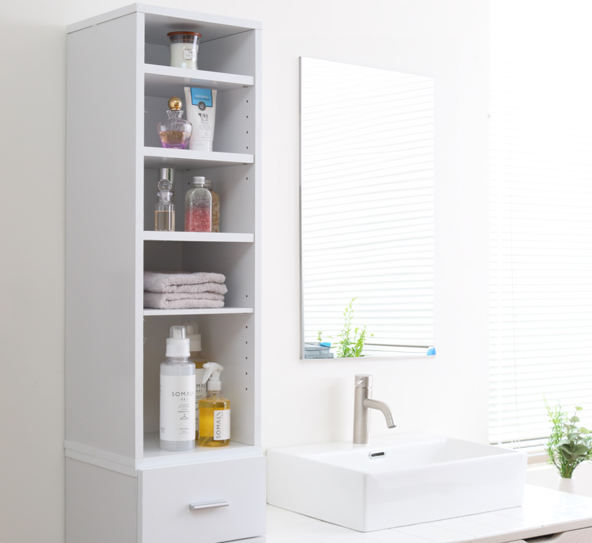 お部屋のちょっとした隙間に収まるスリムな収納ラックです。上部は、使いたいものをすぐ手に取れるオープン収納。下部は細かいものを整理できる引出し収納で、スリムなのにたっぷりと収納することができます。洗面所やキッチン、リビングなどの様々なスペースで便利にお使いいただけます。