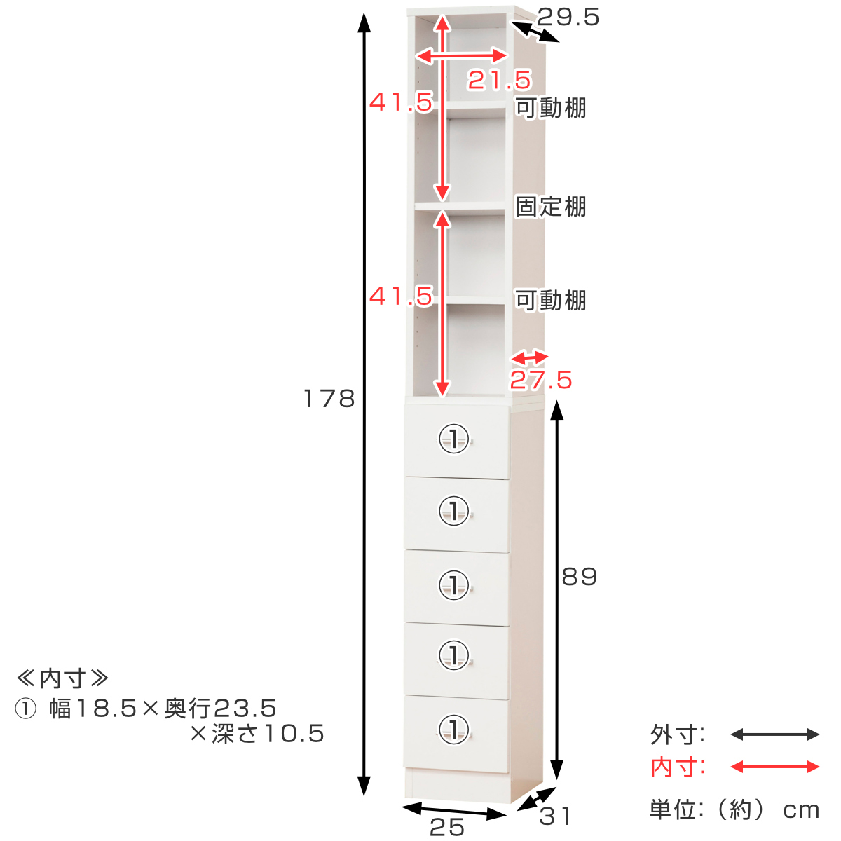 | サイズ | 約 幅25×奥行31×高さ178(cm) ラック内寸:約 幅21.5×奥行27.5×高さ41.5(cm) 引出内寸:約 幅18.5×奥行23.5×高さ10.5(cm) |