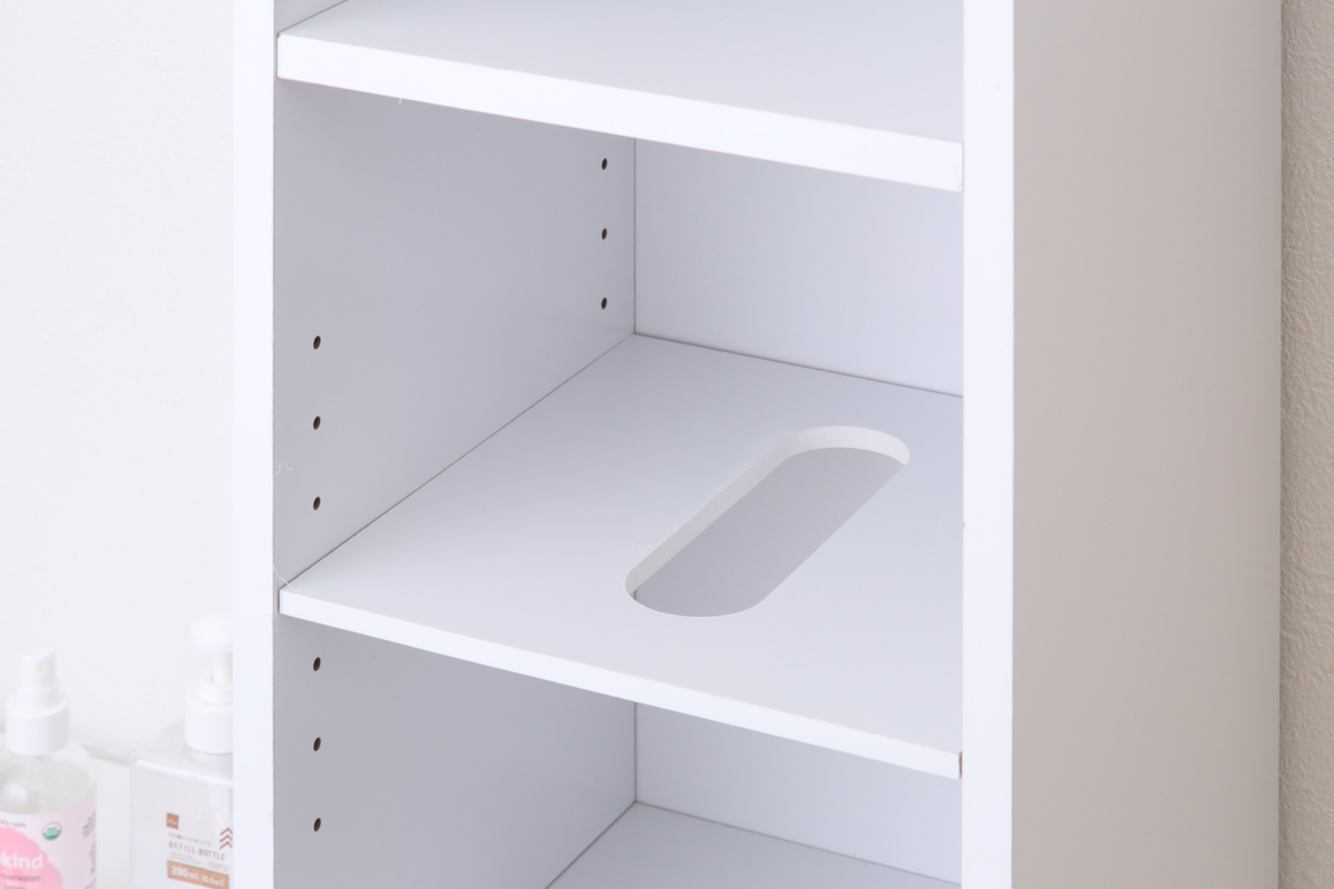 タオルは積んでおくとついつい上から使ってしまいがち。こちらのタオル用の棚板は、タオルを穴から引き出して下から順番に使うことができるので、積みあげたタオルが崩れる心配もありません。
