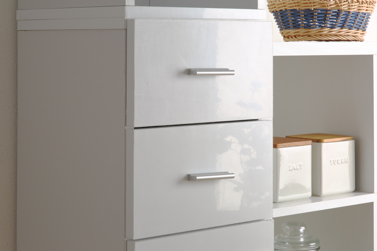 引出しの前面は美しい鏡面仕上げです。汚れや水に強く、お手入れが簡単です。