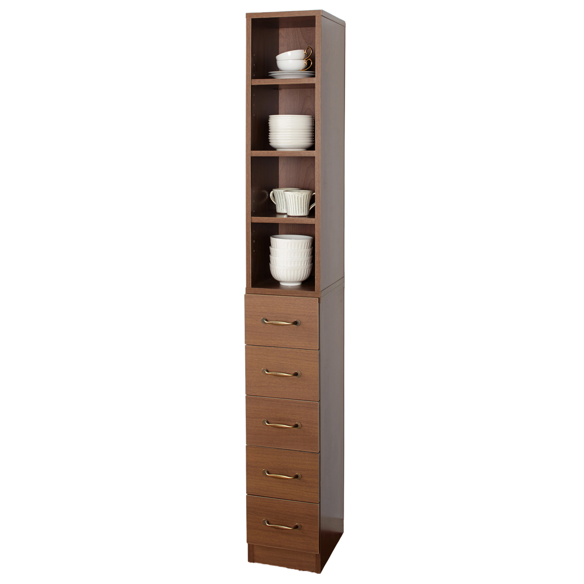 スリムラック 幅25cm 収納ラック 棚 すき間収納 ストッカー 引出し5段 ( ラック 本棚 チェスト キッチン収納 ランドリー A4対応 タオル収納 上下分割 セパレート 隙間 ブラウン ホワイト 可動棚 ) 【ブラウン】