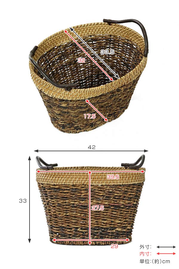 | サイズ | 外寸:約 幅42×奥行33.5×高さ33(持ち手を含む)(cm) 内寸:約 上部幅39.5/下部幅29×上部奥行32/下部奥行17.5×高さ27.5(cm) |