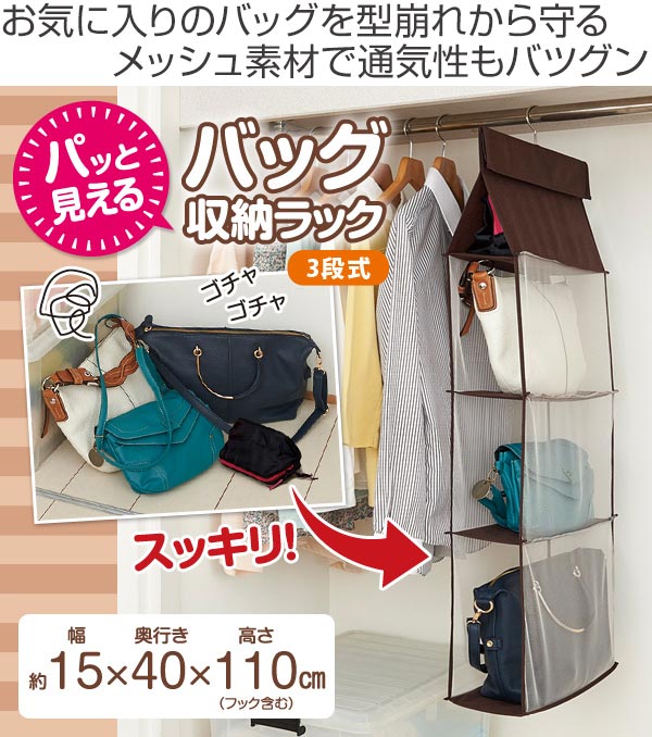 クローゼット収納 パッと見える バッグ収納 ラック3段式 3個セット ( 鞄 バッグ収納ラック バッグ かばん カバン 収納 クローゼット 吊下げ収納 吊下げ 吊り下げ 収納ラック )