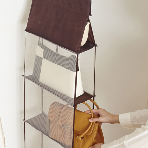 幅約15cmと、コート1枚ほどの厚みながらバッグを最大4つまで収納できます。最下段は高さが30cmあり、大き目のバッグも入る大きさです。さらに一番上にはポーチやクラッチなど小さなバッグを収納することができます。