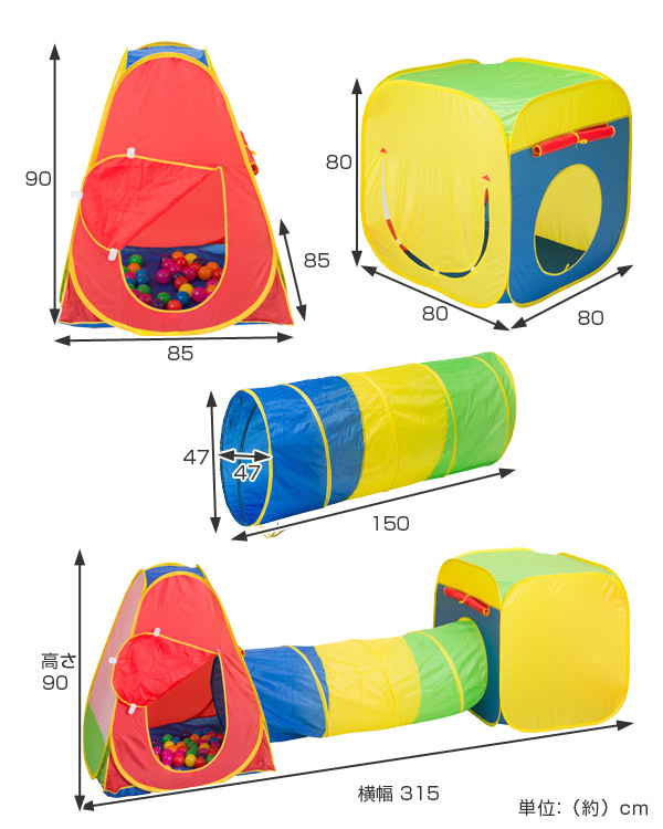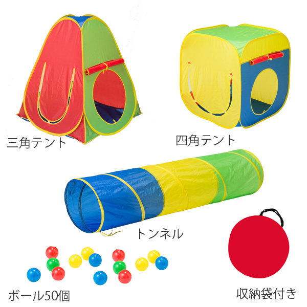 | 内容量 | 1セット(三角テント、四角テント、トンネル、収納袋) 付属品:ボール50個 |