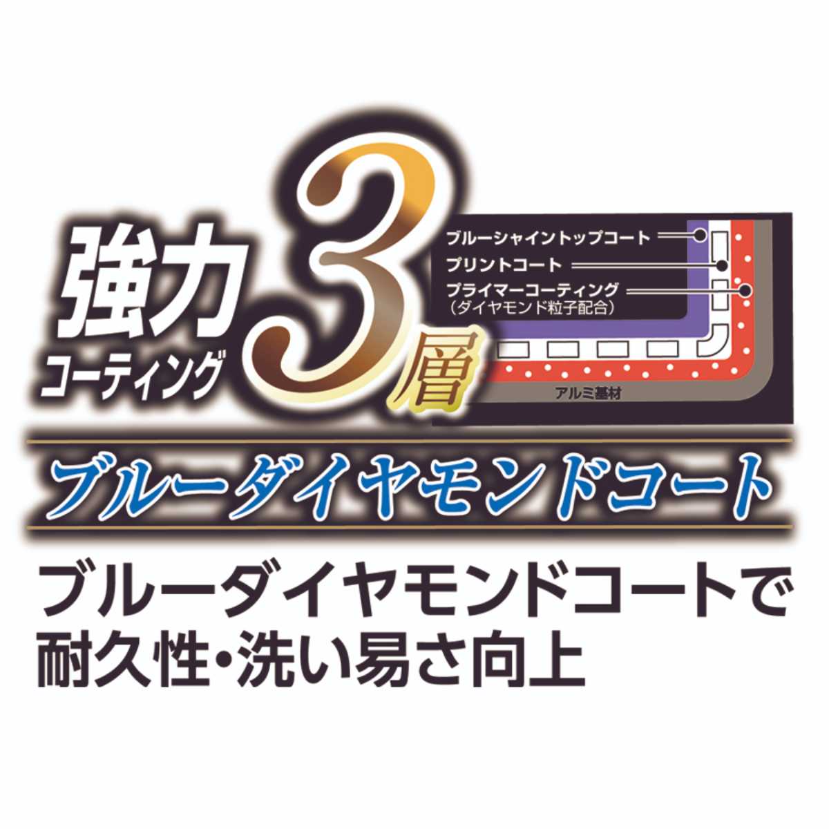 3層強力コーティング、ダイヤモンド粒子配合でキズ・汚れに強く、耐久性に優れています。焦げ付きにくいので簡単に汚れが落ち、お手入れしやすくなっています。