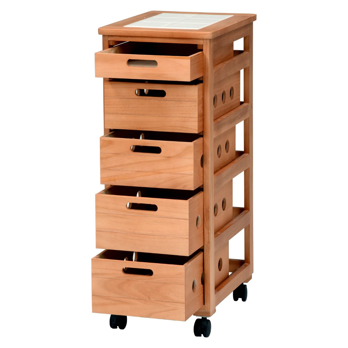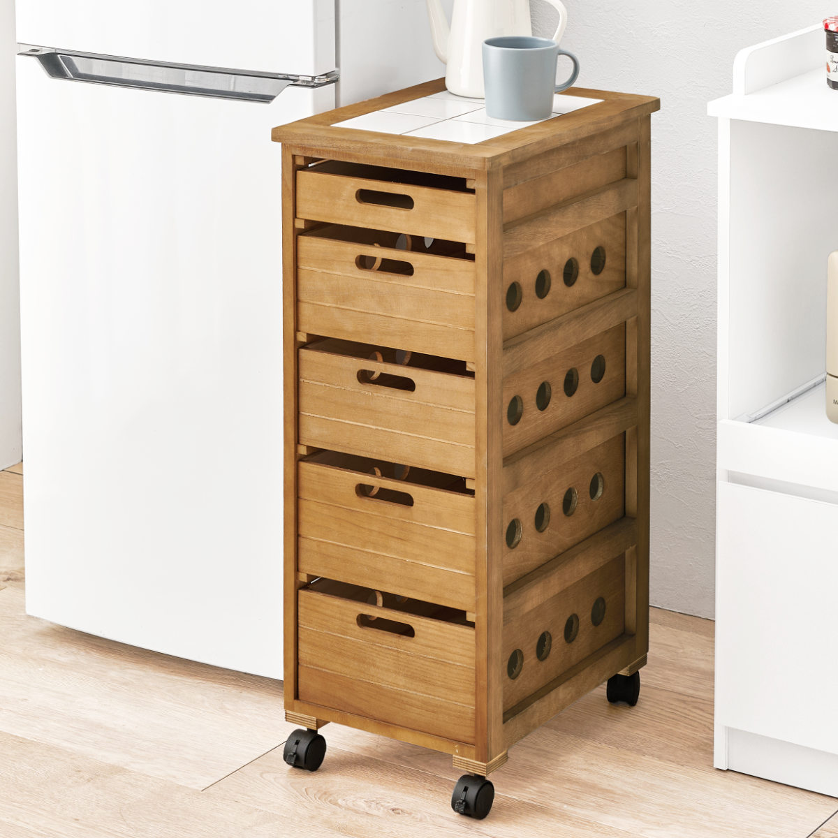 キッチンストッカー 幅30cm 5段 スリムタイプ タイルトップ 桐製 キャスター付 ( ストッカー キッチンワゴン 収納 ラック ワゴン スリム 完成品 引き出し 隙間収納 5杯 棚 タイル天板 桐 木製 多目的ラック タイル カウンター ) 【ブラウン】