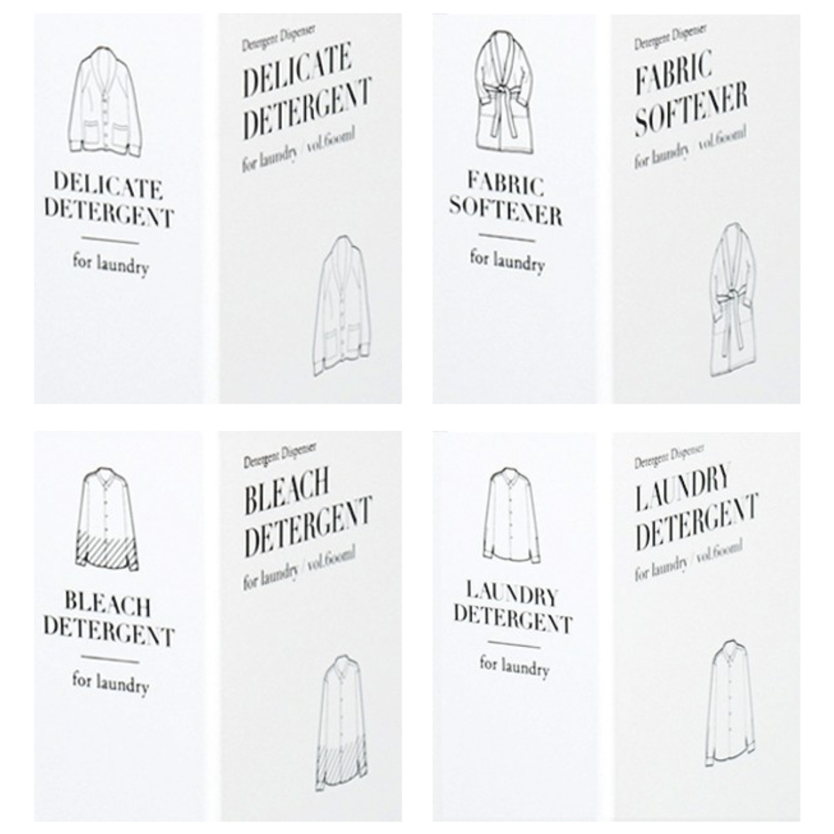 洗剤、柔軟剤、漂白剤、おしゃれ着用洗剤の4種類をご用意しております。シンプルで分かりやすいイラストと文字の清潔感溢れるデザインです。すべて揃えると統一感が出て、心地のよいランドリールームへと導きます。
