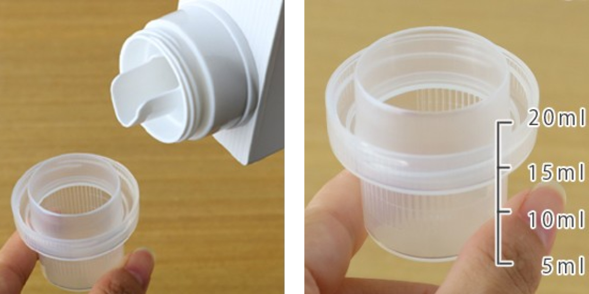 透明のキャップには5ml~20mlまで計量メモリがついています。計量ができるので大変便利です。