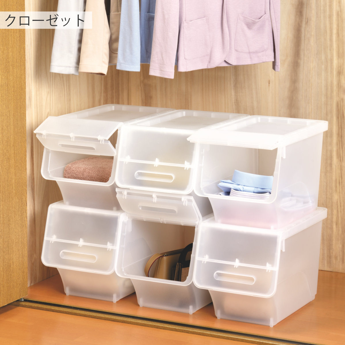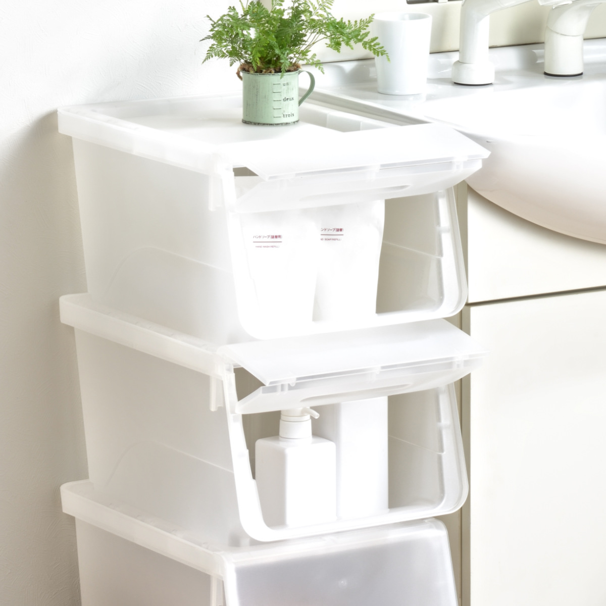 フタ付き衣装ケースなどの収納ケースは、積み重ねて使うと下段から物を取り出すのが一苦労です。「froq -フロップ-」なら前開きフタなので、積み重ねて使っても下段から簡単に物を出し入れすることできます。