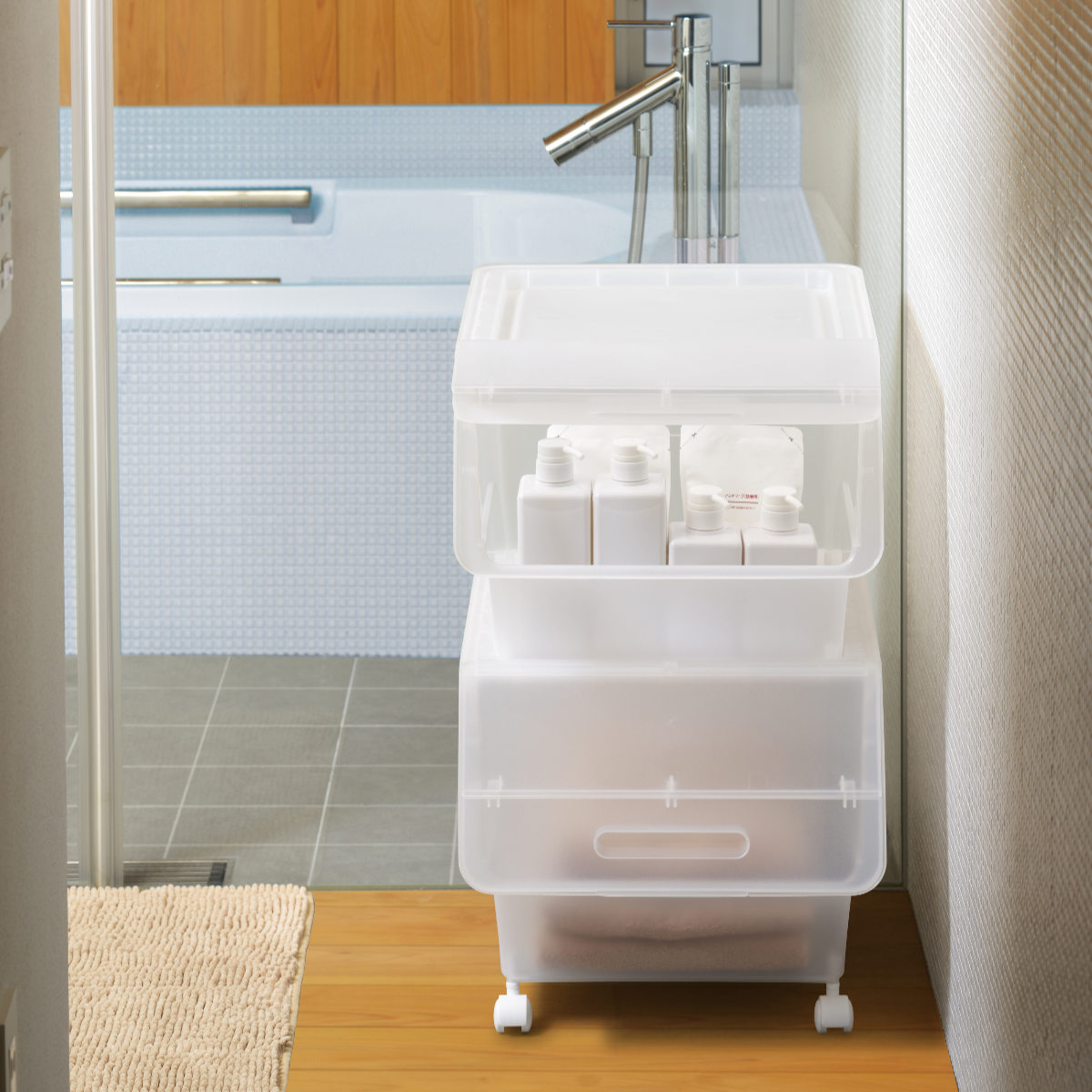 フタ付き衣装ケースなどの収納ケースは、積み重ねて使うと下段から物を取り出すのが一苦労です。「froq -フロップ-」なら前開きフタなので、積み重ねて使っても下段から簡単に物を出し入れすることできます。