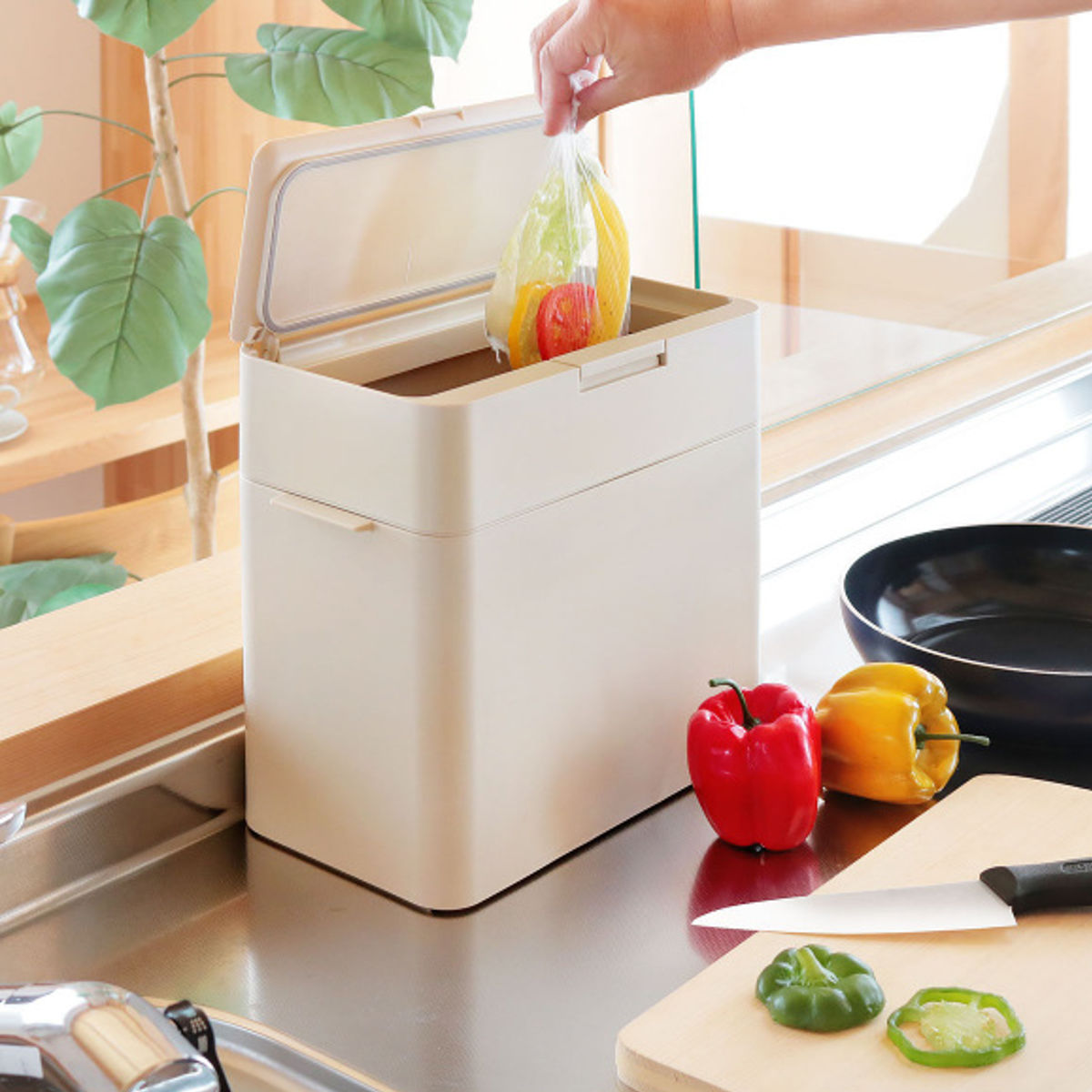 ピタッと閉まるシリコンパッキン付きのふたで、ニオイ漏れをしっかり抑えます。生ごみ用のダストボックスとしてシンク上に置けば、その場でサッと捨てられて便利。ゴミを溜めてから移す手間が省け、家事の効率もアップします。ニオイが気になりにくく、キッチンを快適な空間に保てます。