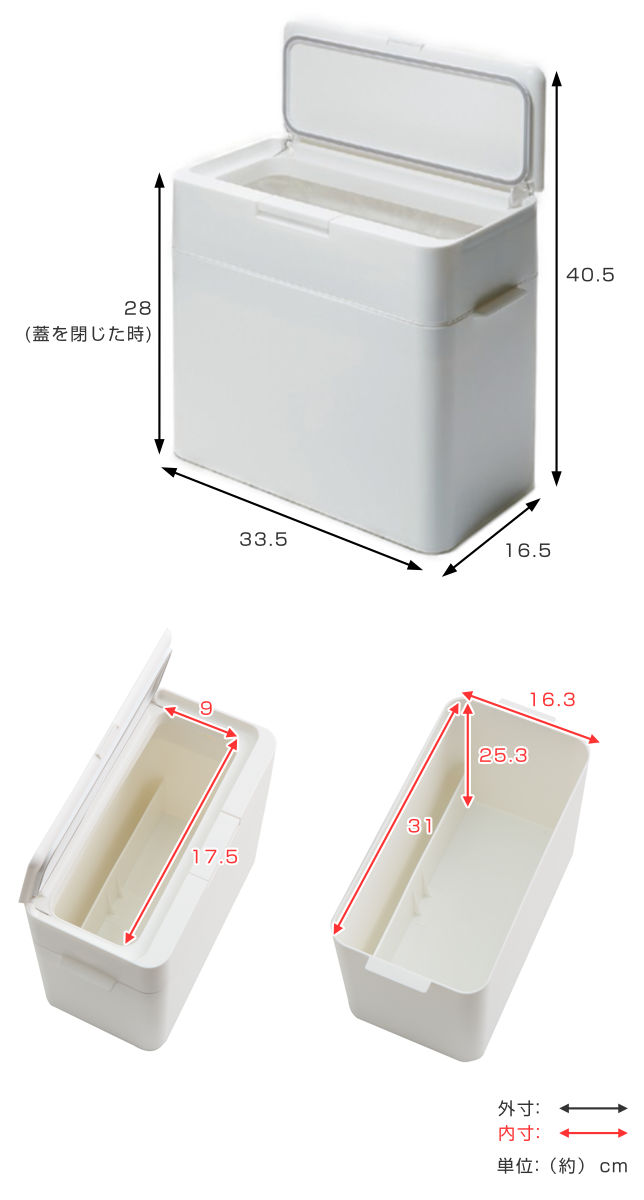 | サイズ | 約 幅33.5×奥行16.5×高さ28(cm) 取っ手を除いた幅:約 30.9(cm) 蓋を開けた時:約 高さ40.5(cm) |