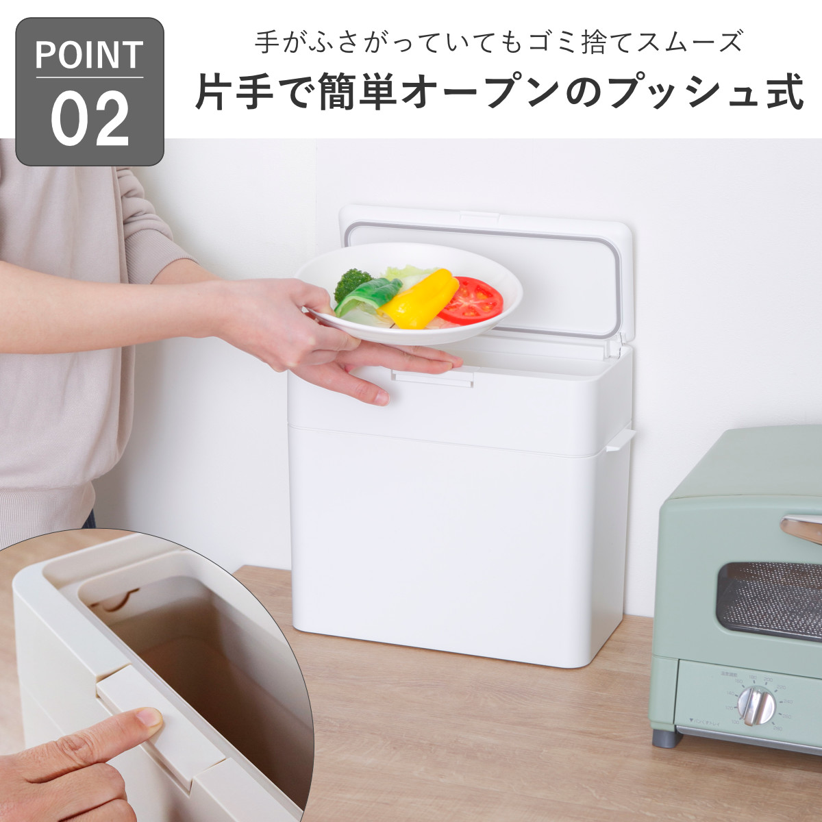ゴミ捨てのちょっとしたわずらわしさを軽減するプッシュ式。手がふさがっていてもスムーズに開閉でき、片手にお皿を持ったままでもサッと捨てられます。