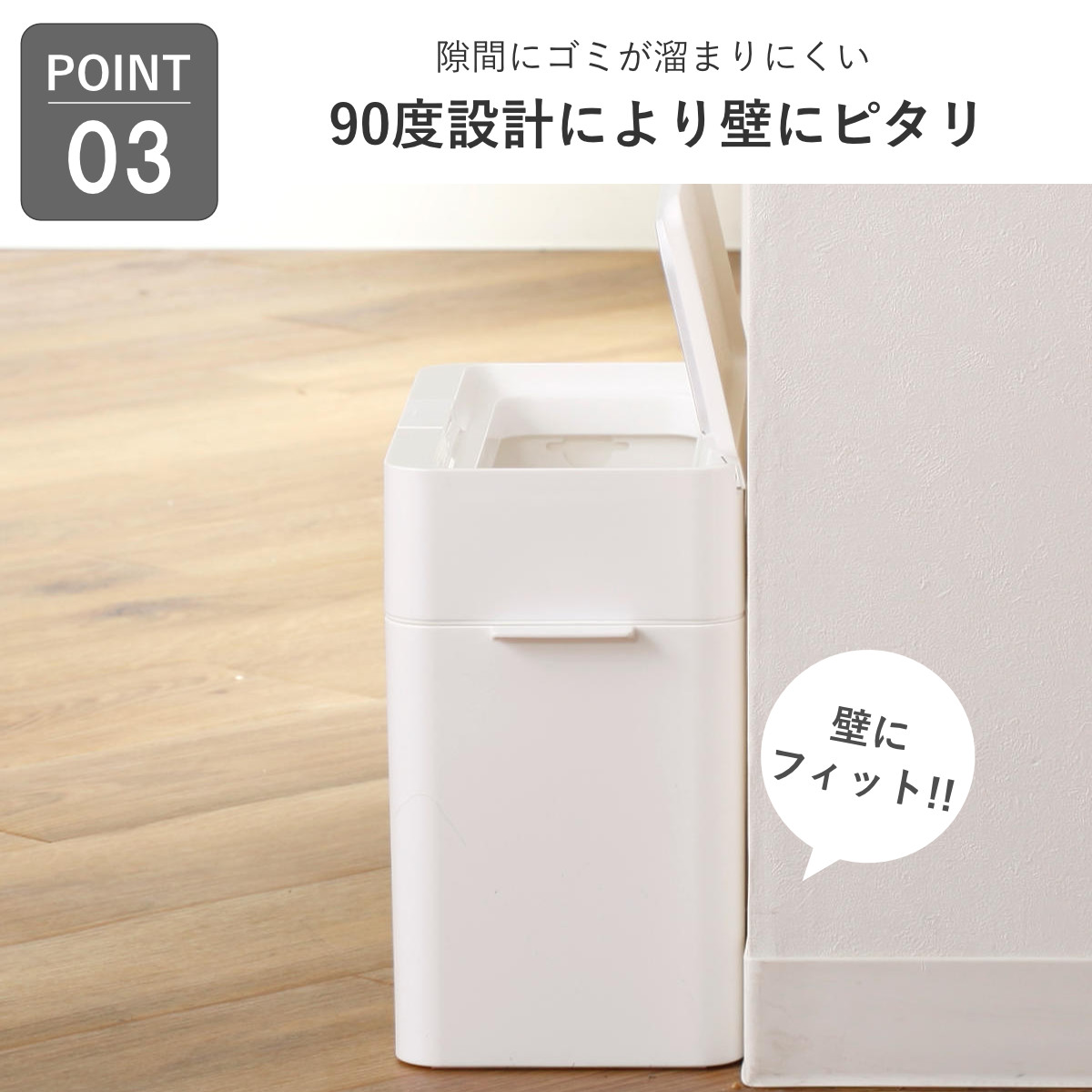 壁にぴったり収まる90度設計で、無駄のないすっきりとした印象に。デッドスペースができにくく、隙間にゴミが溜まりにくいのも嬉しいポイントです。