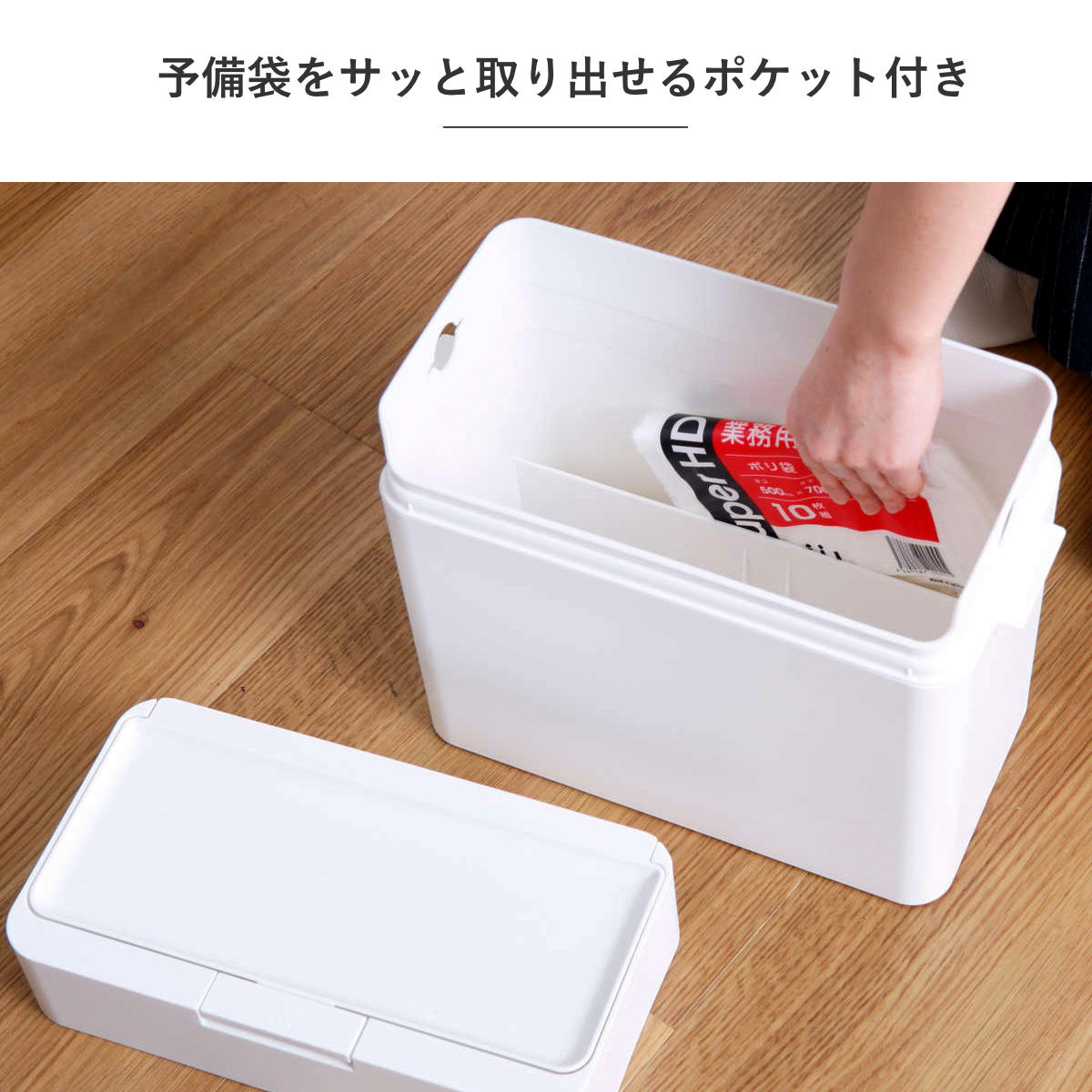 本体に予備のゴミ袋を収納できるので、必要なときにすぐ交換できて手間いらず。ゴミ袋交換の時間を短縮でき、家事の時短にもつながります。