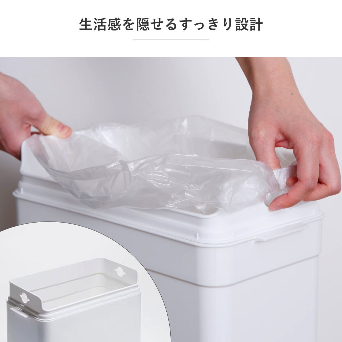 ゴミ袋は本体にかぶせて、枠の穴に押し込むだけで簡単にセットできます。手間なくきれいに装着できるので、交換もスムーズです。ふたを閉めればゴミ袋が外から見えにくく、生活感を抑えてお部屋の雰囲気を損ないません。