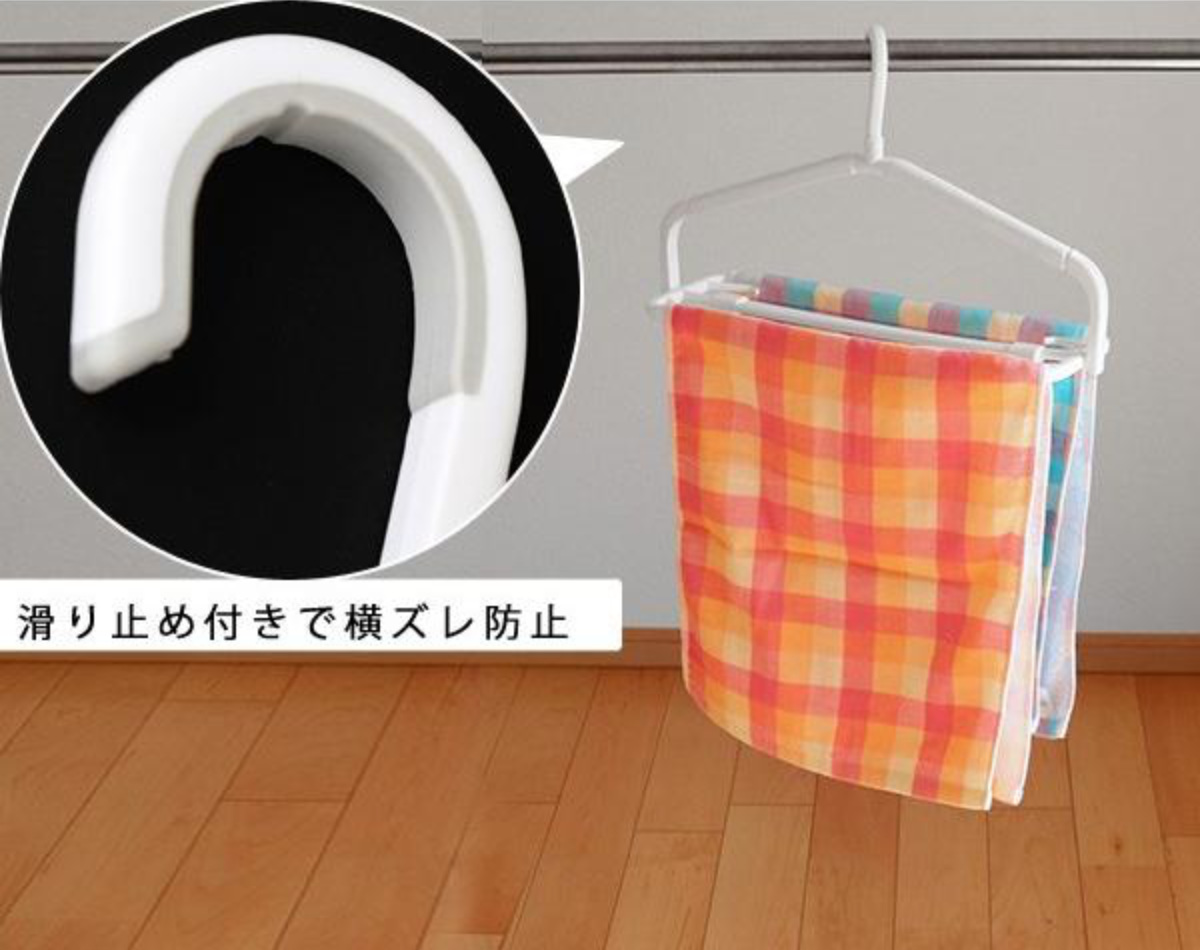 フック部分は90度ごとに回転固定するから安定感バツグンです。また、風などでの移動を防ぐノンスリップ(滑り止め)が施されています。パイプハンガーにかけるのにちょうど良いフックですので、室内干しにもオススメです。