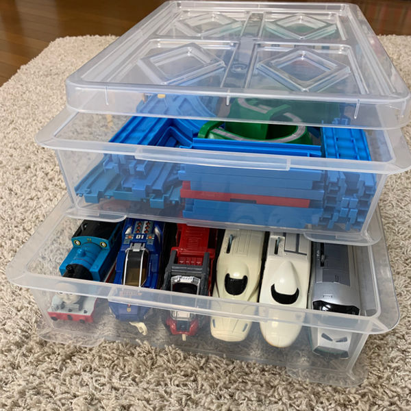 電車やレールなどのおもちゃも収納できます。ケースの中でバラバラになりがちな車両もきっちり収納できると壊れにくく、お子様も出し入れがしやすいです。