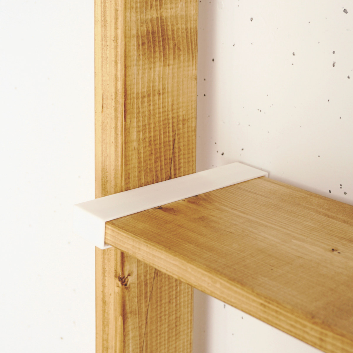 別売りのアジャスターを使って立てた1×4や2×4の柱に、1×8の棚板を取り付けるための棚受けパーツです。支柱に取り付けた支えパーツのアダプターに、棚キャップをかぶせた棚板をはめ込むことで、しっかりと設置できます。後付けタイプの棚受けのため、支柱の設置後に棚の高さを自由に決められます。