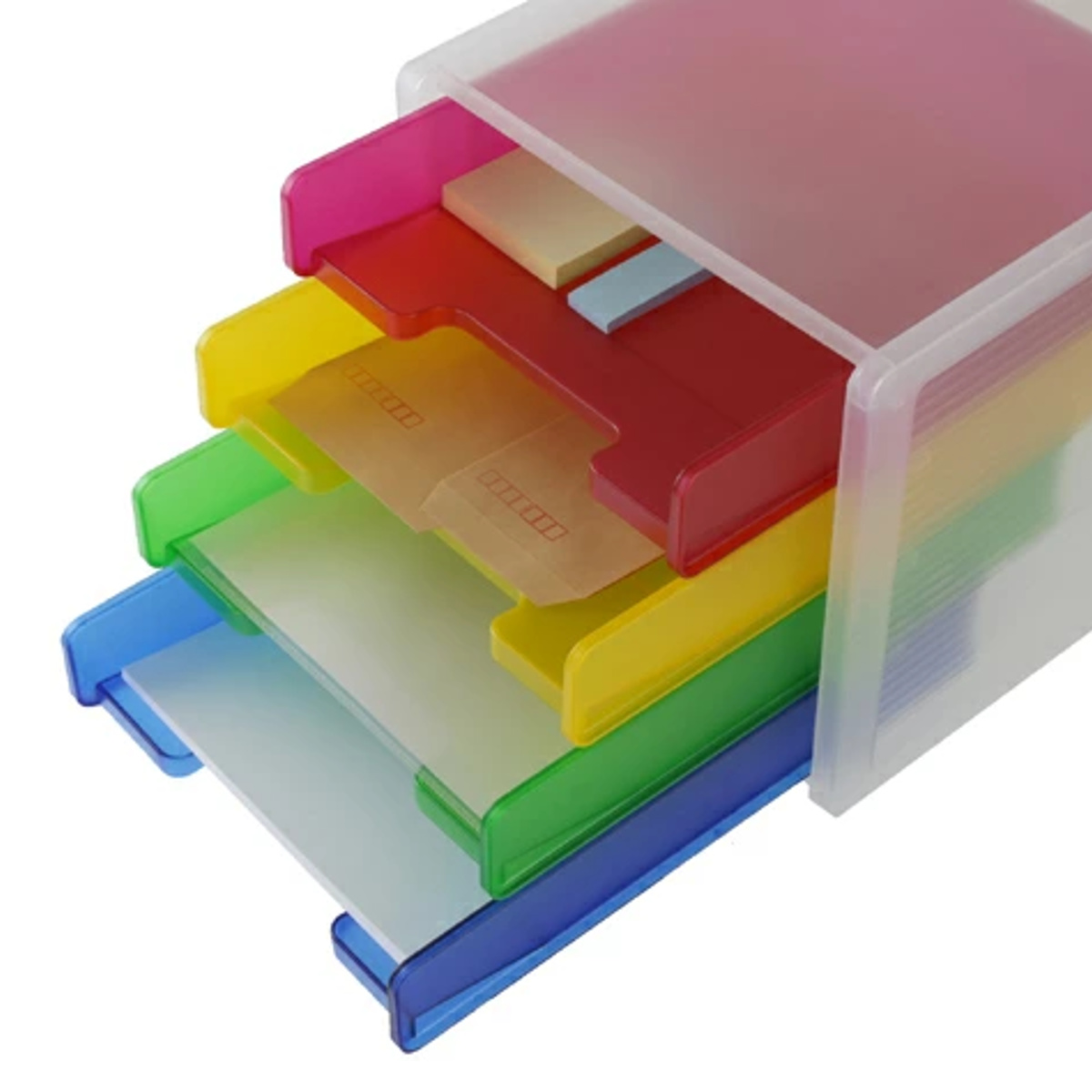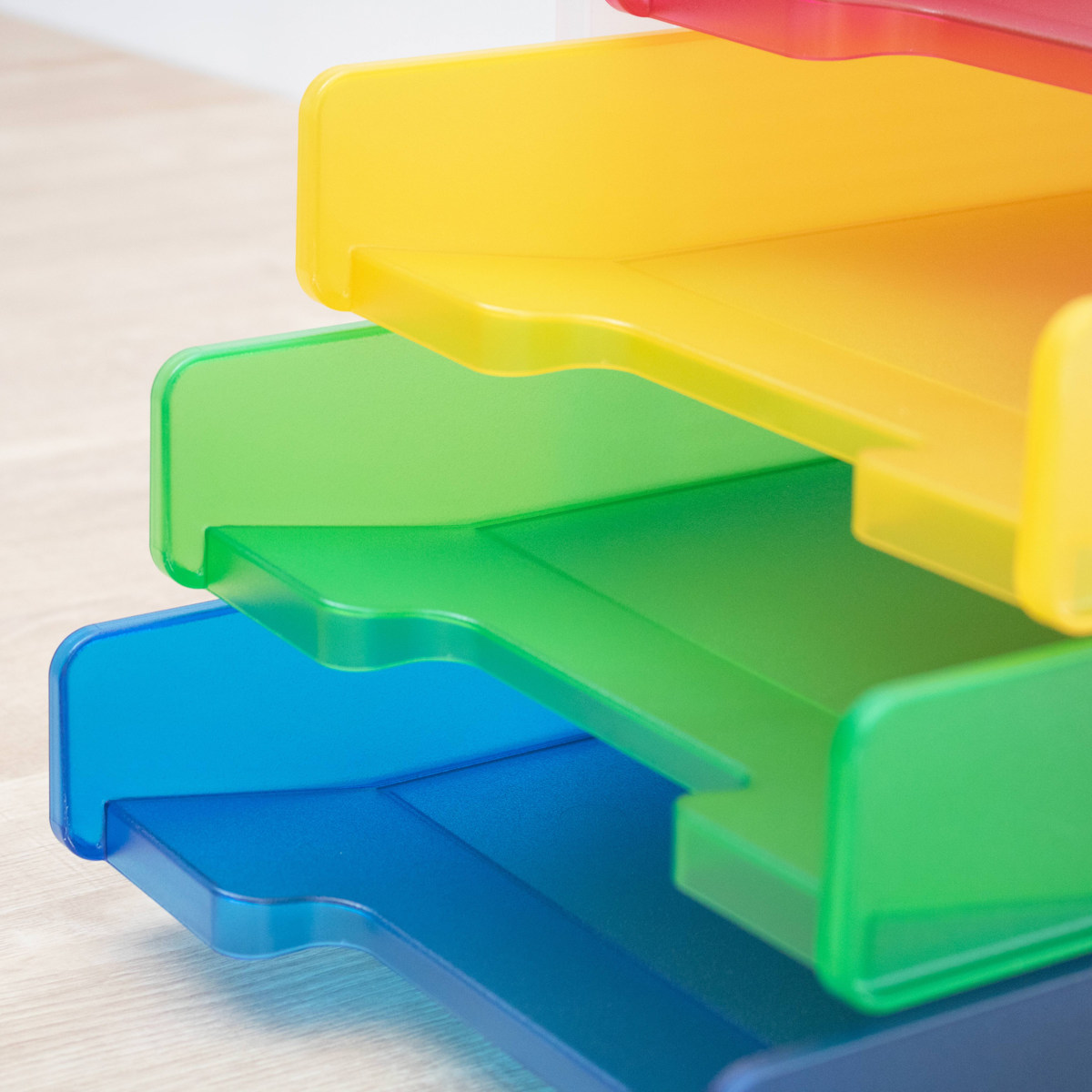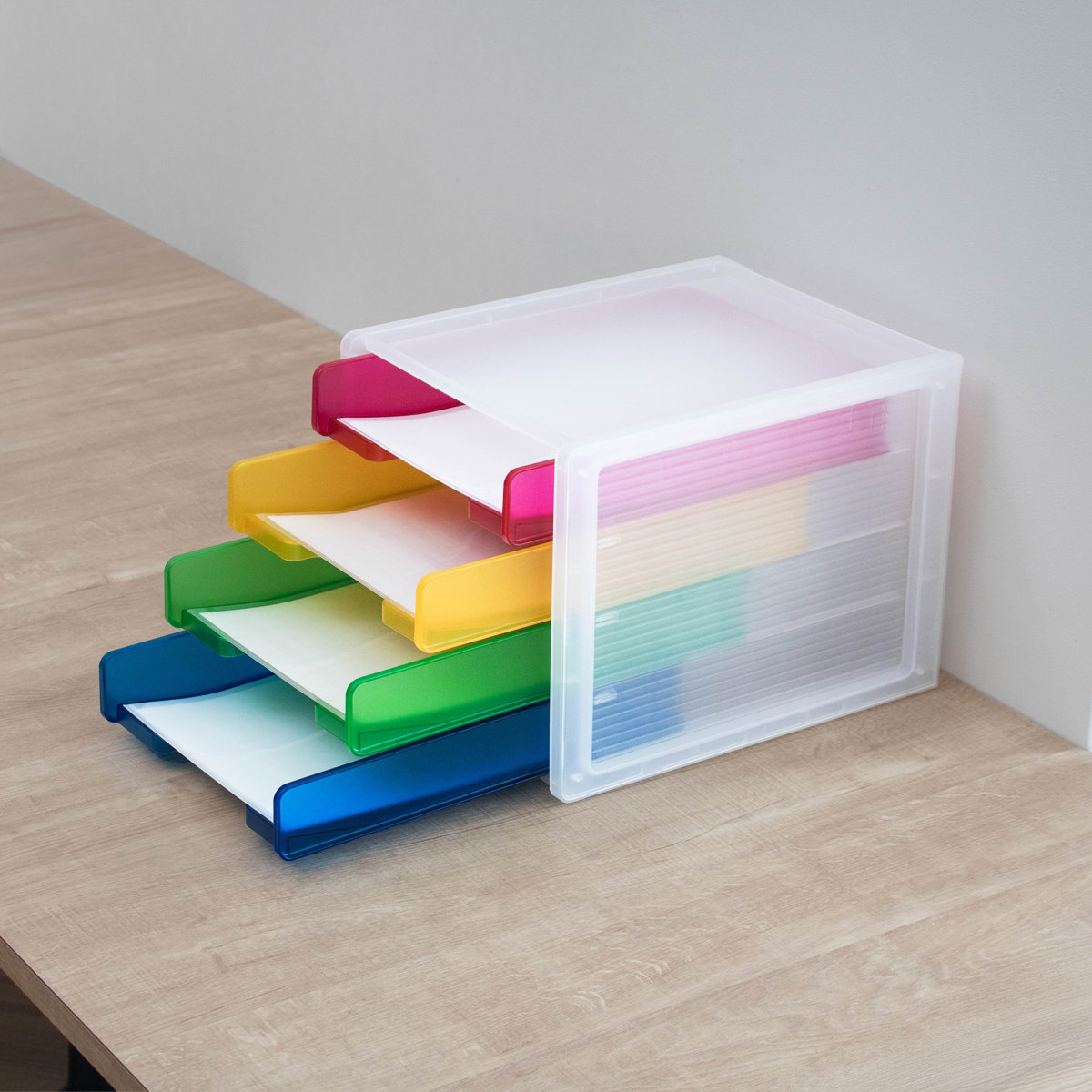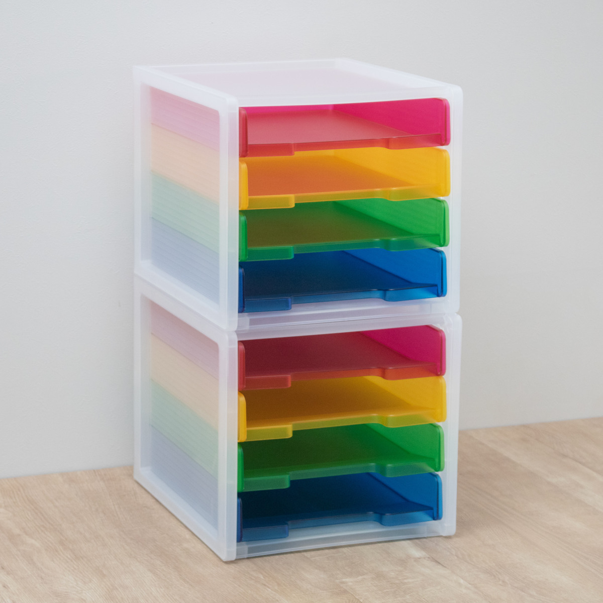 4段それぞれカラーが異なるカラフルなトレー仕様。色分けして書類を収納することで、何がどこにあるか一目で把握しやすくなります。定位置管理もしやすく、書類の紛失防止や整理整頓に便利です。お子様にも分かりやすく、学校のプリントや宿題の整理にもおすすめです。