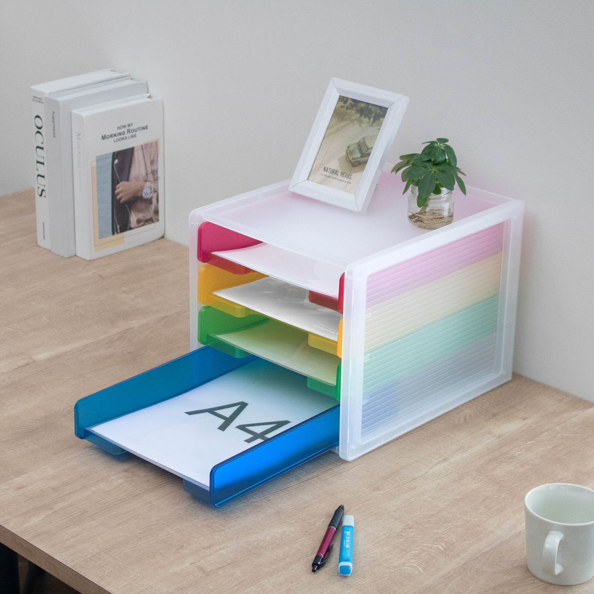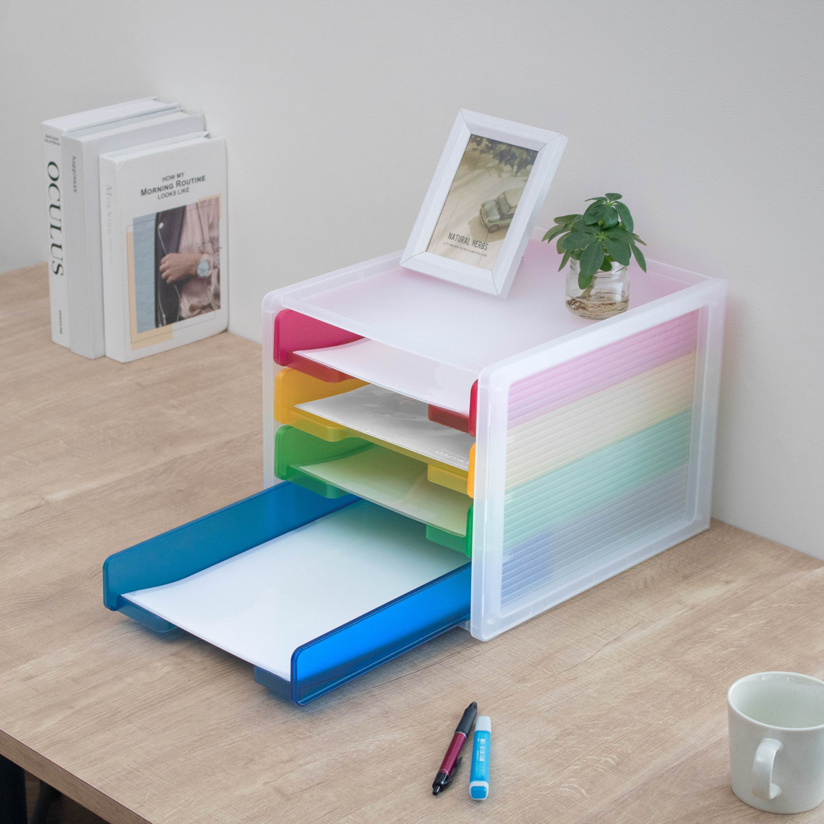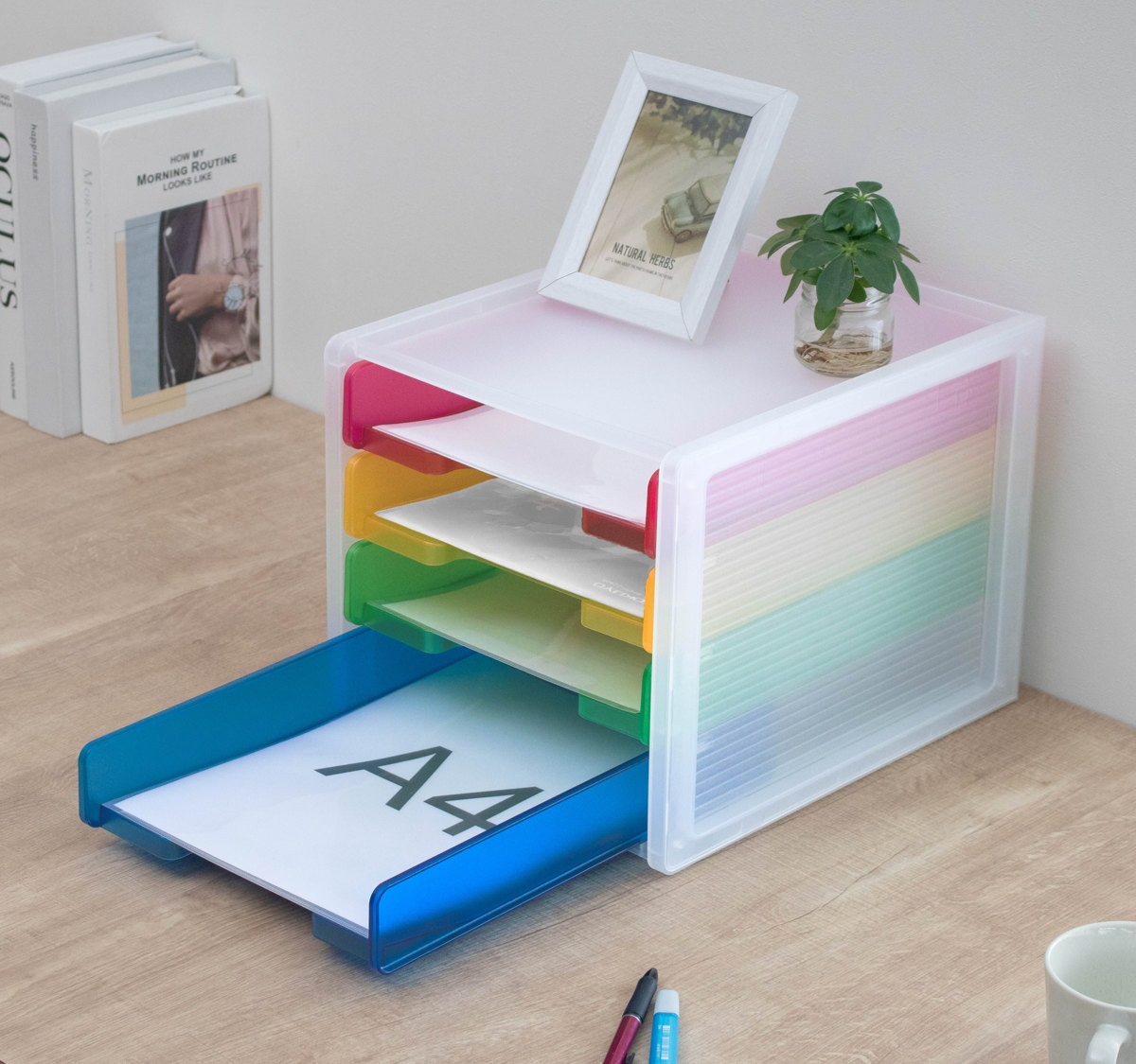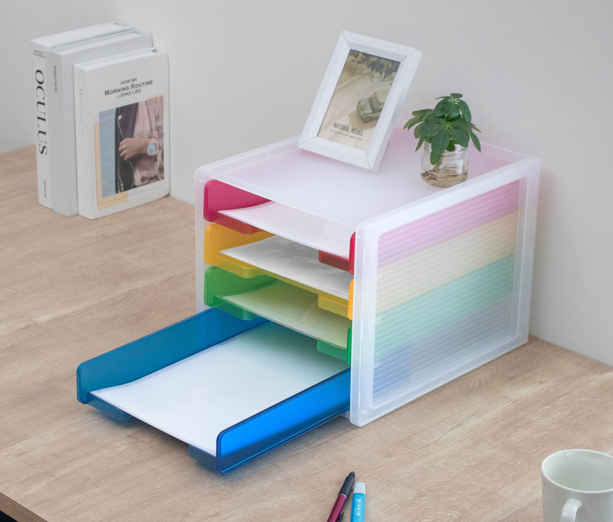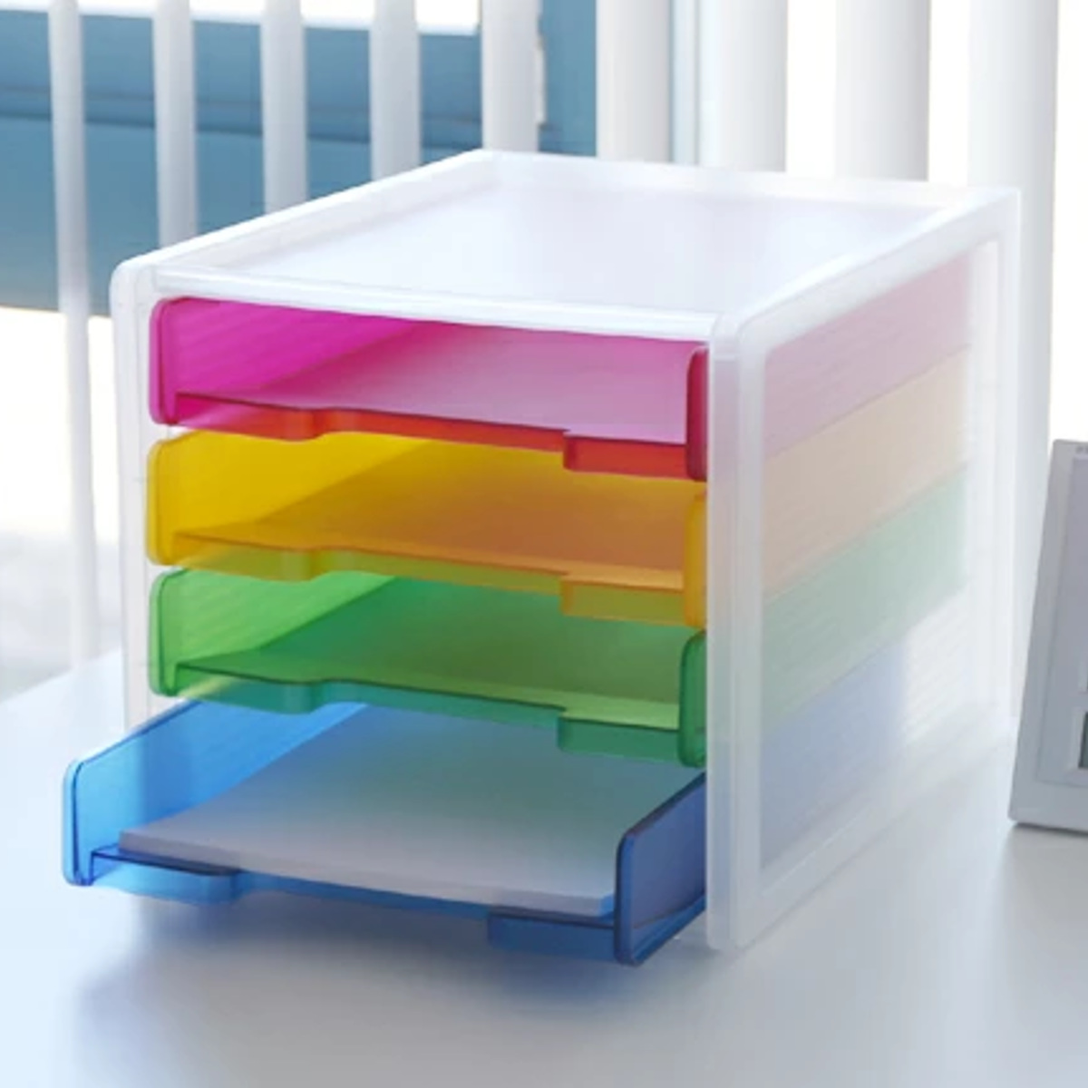 4段それぞれカラーが異なるカラフルなトレー仕様。色分けして書類を収納することで、何がどこにあるか一目で把握しやすくなります。定位置管理もしやすく、書類の紛失防止や整理整頓に便利です。お子様にも分かりやすく、学校のプリントや宿題の整理にもおすすめです。