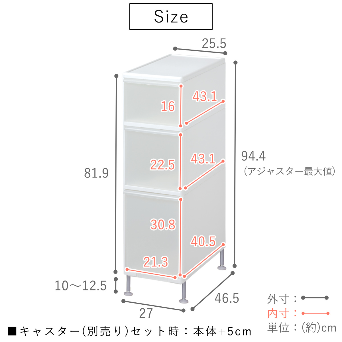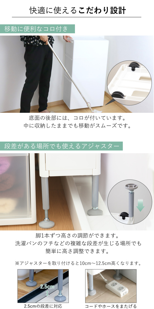 | 材質 | 本体・引き出し:ポリプロピレン アジャスター:ポリプロピレン、スチール |