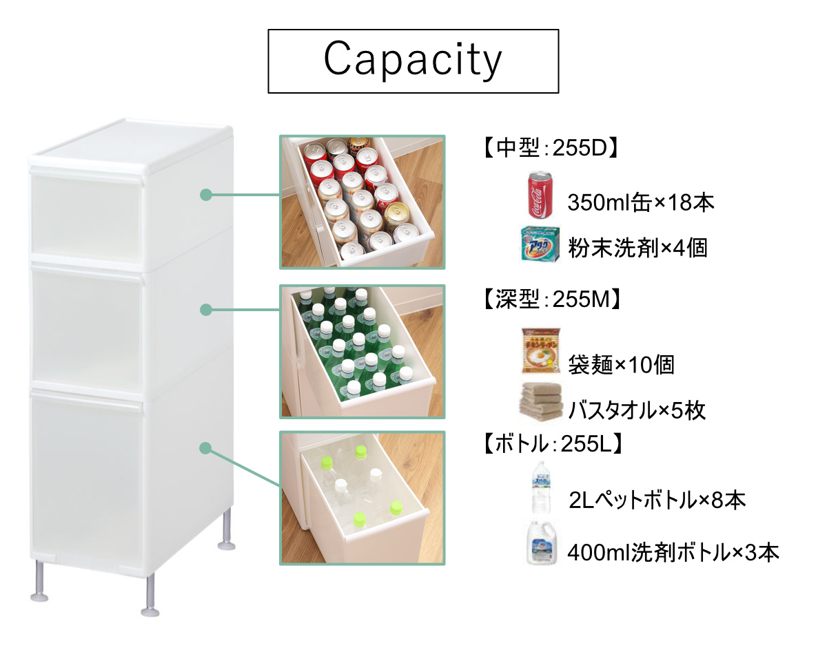 | 引き出し1段あたり耐荷重 | 中型・深型:約 5kg ボトル:約 14kg |