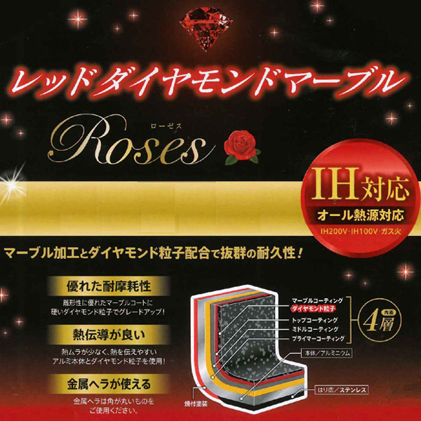 フライパン レッドダイヤモンドマーブル ローゼス IH対応 フライパン 26cm ( ガス火対応 浅型フライパン 26センチ 軽量 いため鍋 炒め鍋 調理器具 キッチン用品 浅型 オール熱源対応 アルミ製 アルミ鍋 なべ 鍋 )