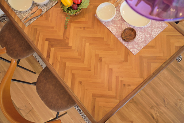 木と木を繋ぎ合わせることで生まれた、へリンボーン模様が特徴のテーブルシリーズ。いつもいる空間に、ほんの少しの「こだわり」をプラスすることで、いつもとは違った光景が目の前に広がります。