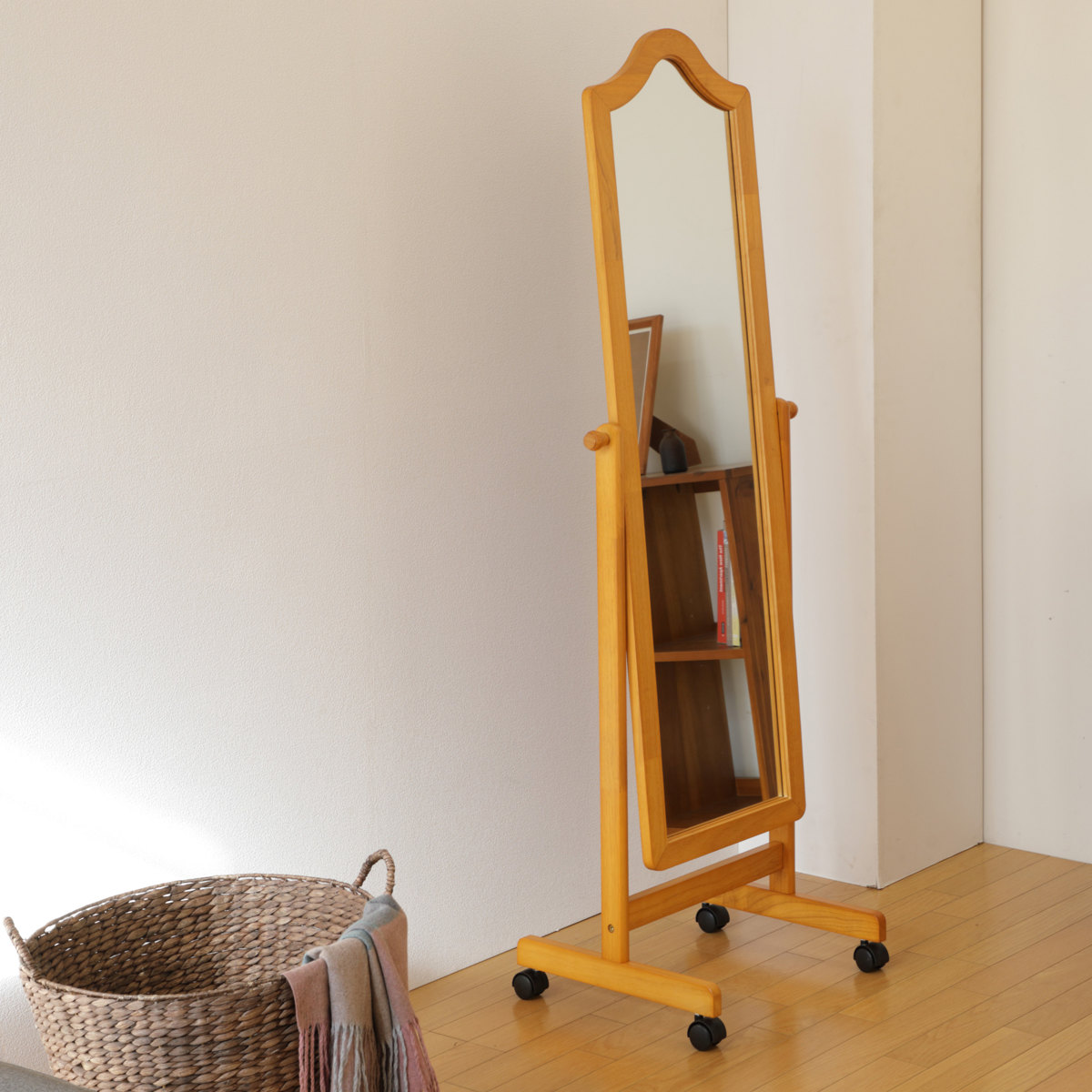 キャスター付きで移動も簡単な木製フレームスタンドミラー