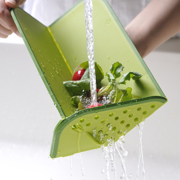 真ん中で折りたたみ、留め具をカチッと留めると水切りに!カットしたあとの食材をそのまま簡単に水洗いすることができます。