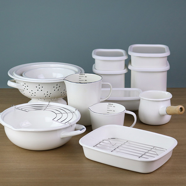 ホーローとは鉄にガラス質を施し高温で焼き上げた素材で、料理の味を変えることがなく、素材のよさを生かして調理でき、保存性にも優れています。酸やアルカリに強く、腐食しにくいので長くご愛用いただけます。