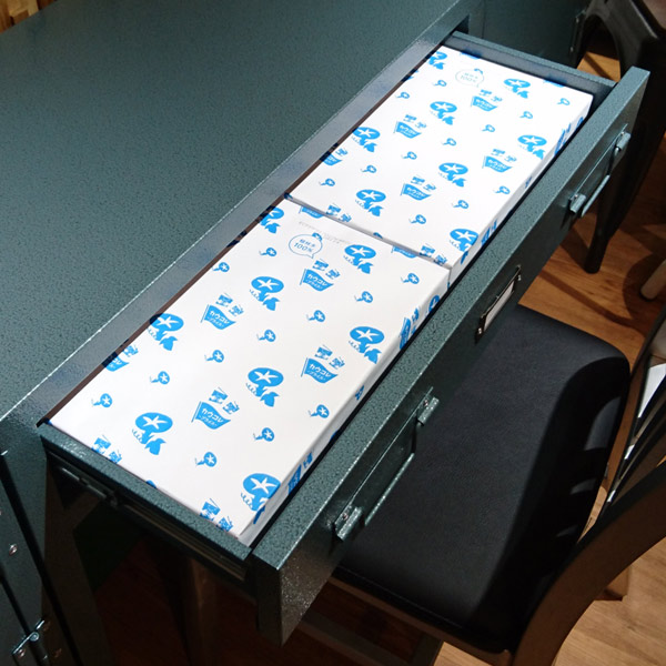 ●収納スペースはよく使うA4コピー用紙(500枚の束)が横にして2束入るしっかりサイズです。
